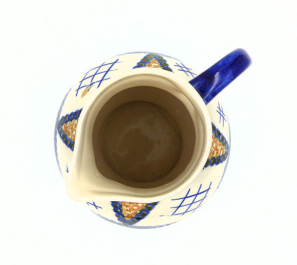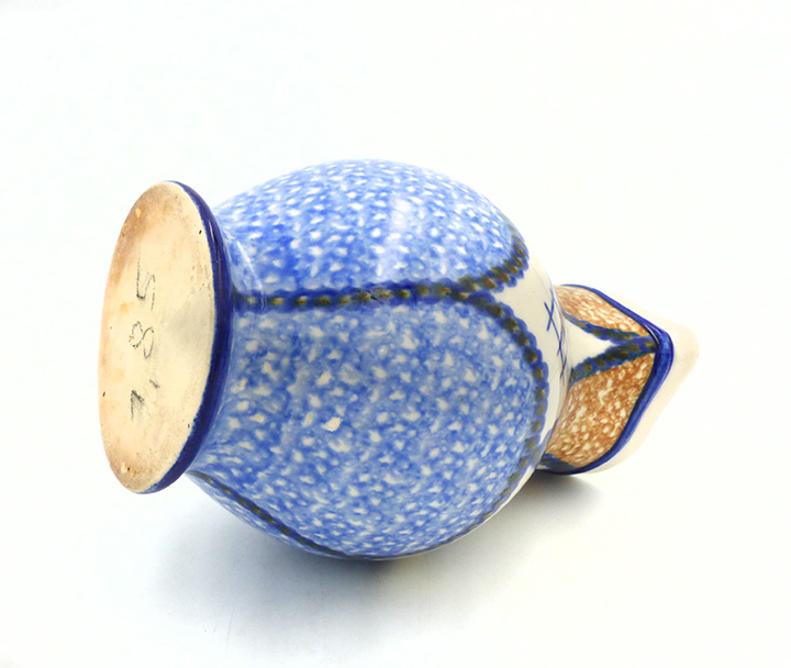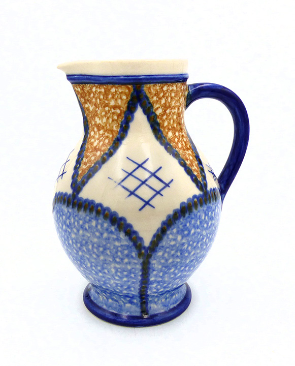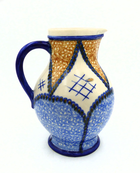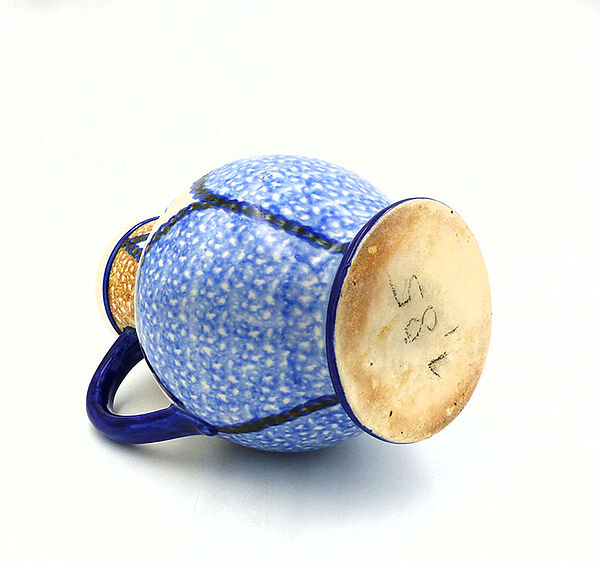 In der unteren Hälfte gebauchter, im Halsbereich leicht taillierter Korpus mit C-förmiger Handhabe und leicht ausgestelltem Mündungsrand mit Schnaupe aus hellem Scherben. Außenseitig handgemaltes abstraktes Dekor aus vom Rand ausgehenden, dreieckigen, ockerfarbenen bzw. vom Stand ausgehenden, halbrunden, hellblauen Flächen, die jeweils dunkelblau umrandet sind. In den Zwischenräumen gitterförmiges Liniendekor. Höhe ca. 21 cm, geringe Altersspuren. Der Krug ist zwar nicht gemarkt, kann aber aufgrund des typischen Dekors klar der Kunsttöpferei Neschwitz (1910 - 1939) zugeordnet werden.