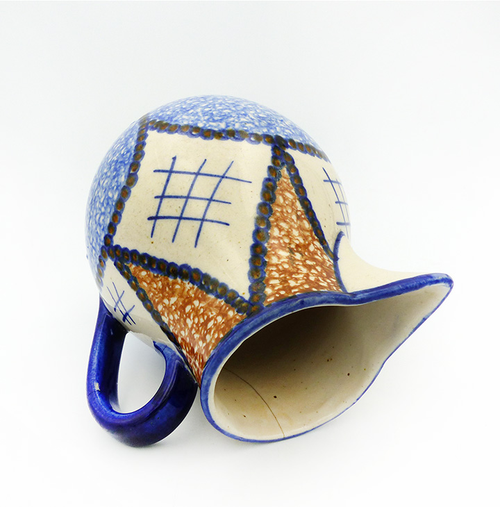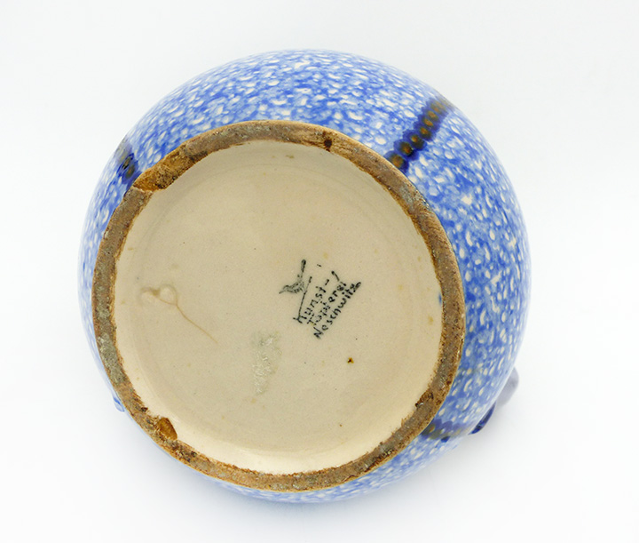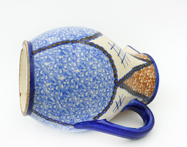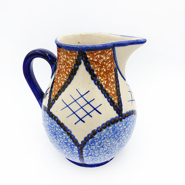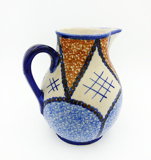 Korpus in klassischer Krugform - im unteren Drittel moderat gebauchter, im oberen Drittel leicht eingezogener Korpus, der Rand geht vorderseitig in eine spitz-dreieckige Schnaupe über. C-förmige Handhabe. Außenseitig flächig-abstrakte Dekore in Hellbeige, Blau und Ocker, teilweise geschwämmelt, teilweise getupft, teilweise gemalt. Höhe ca. 18 cm, nur innen sichtbarer, aber durchgehender sehr feiner Riss vom Rand bis zur Mitte des Kruges; unterseitig am Stand zwei Chips; ansonsten geringe Altersspuren. Unterseitig Markung sowie gepresste Nummer "3." (vermutlich Größenangabe). Das Dekor des Kruges ist wohl das bekannteste der Töpferei und stammt aus der Zeit zwischen 1910 und 1939, wo Reinhold Bartsch hier prägend tätig war. Quelle: bogelmusch.blogspot.com/p/blog-page_6.html 03/24