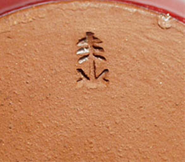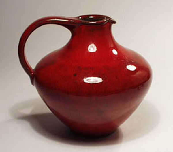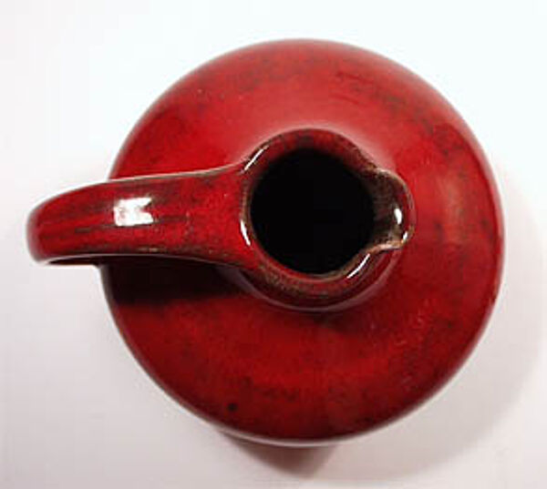 Klassische Krugform, zeittypisch akzentuiert. Hellbrauner Scherben, leuchtend rote, minimal rostbraun marmorierte Glasur. H. ca. 13,5cm, unterseitig gemarkt, wohl 60er / 70er Jahre.