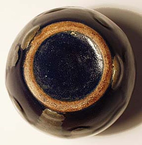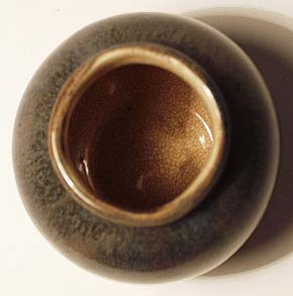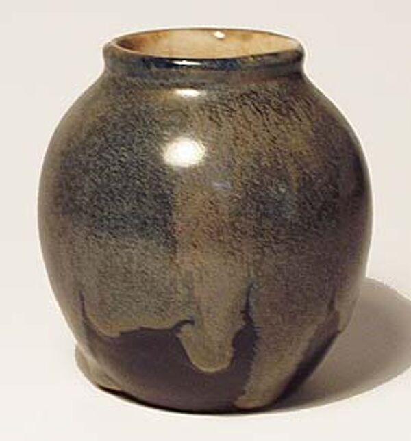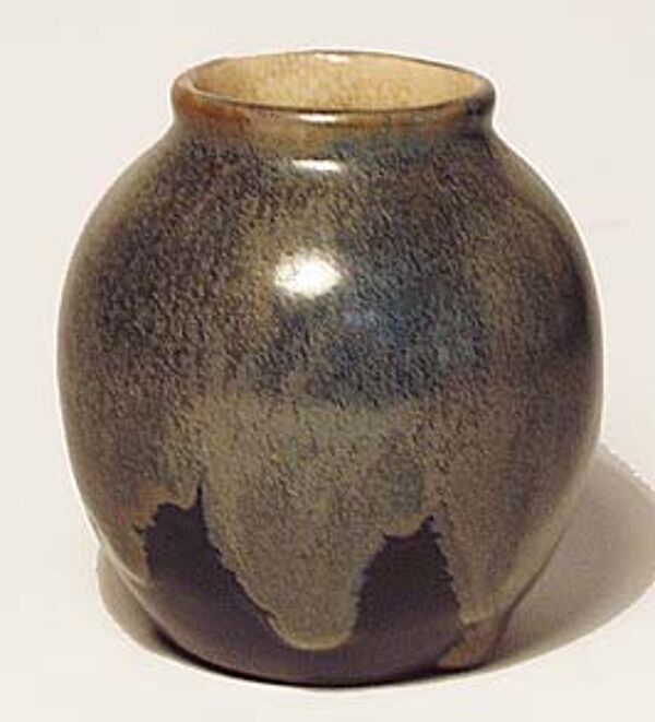 Ovoid gebauchter Korpus mit leicht ausgestelltem Mündungsrand aus hellbraunem Scherben mit blauer Grund- und graublauer Laufglasur. Höhe ca. 8,5 cm. Unbezeichnet, wohl Bunzlau zwischen 1905 und 20.