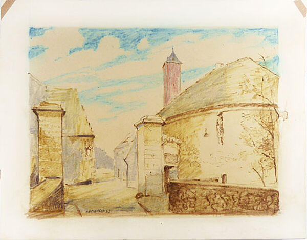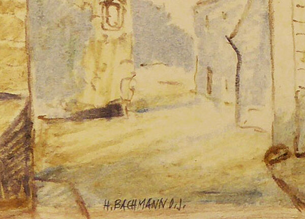 Mischtechnik auf leicht chamoistonigem Papier, am linken unteren Rand handsigniert "H. Bachmann D.J." (D.J. steht hier für "Der Jüngere", da der Vater des Künstlers ebenfalls Maler war und auch mit "H. Bachmann" signierte). Blattmaße ca. 27,5 x 22 cm, Bildmaße ca. 22,6 x 17,6 cm, geringe Altersspuren, rückseitig Klebereste einer alten Montierung. Wohl frühe Arbeit des Künstlers aus den 1940er Jahren.
