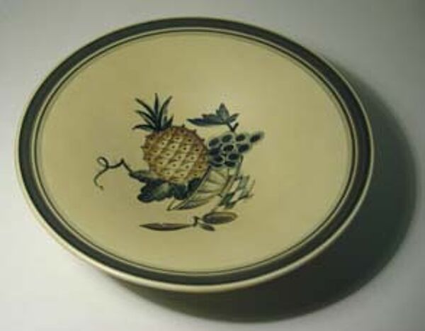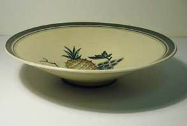 Schalenförmiger Korpus, wobei Spiegel und breite Fahne ineinander übergehen. Heller Scherben mit seidenmatter gelblicher Glasur. Im Schalengrund handgemaltes, neusachlich anmutendes, polychromes Früchtestillleben. Durchmesser ca. 30 cm, Höhe ca. 8 cm, minimalste Gebrauchsspuren. Unterseitig gemarkt (Marke zwischen 1928 - 32) sowie weitere (ungedeutete) Zeichen.