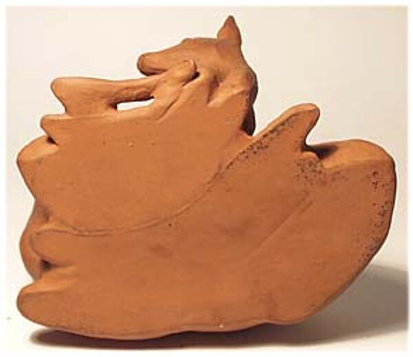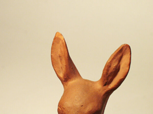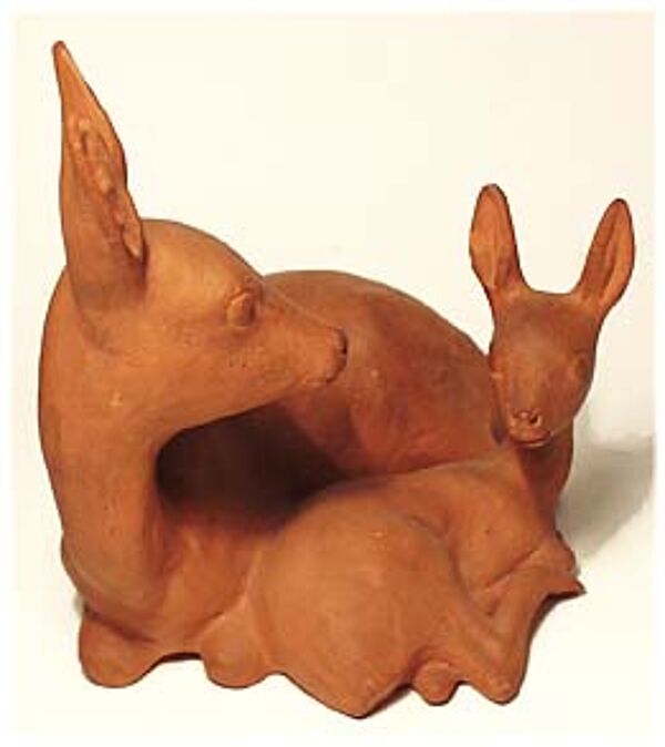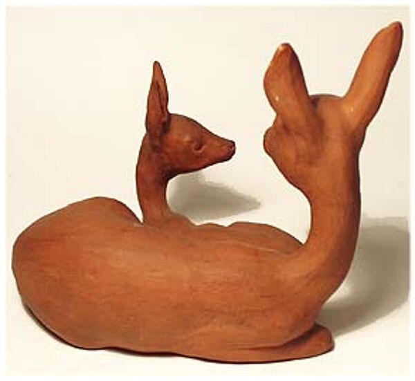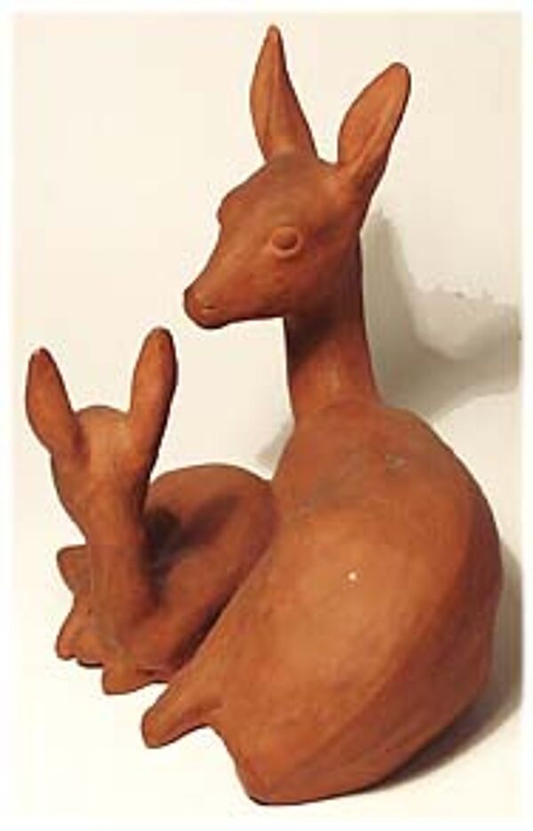 Korpus aus gegossenem Ton; brauner, unglasierter Scherben. Dargestellt sind zwei liegende Rehe, vermutlich Ricke mit Kitz. Höhe ca 14 cm, je kleiner, kaum ins Auge fallender Abschlag am Ohr von Muttertier und Kitz. Unterseitig gemarkt "GK" sowie Form- oder Dekor-Nummer "8", wohl 20er, 30er Jahre.