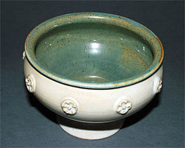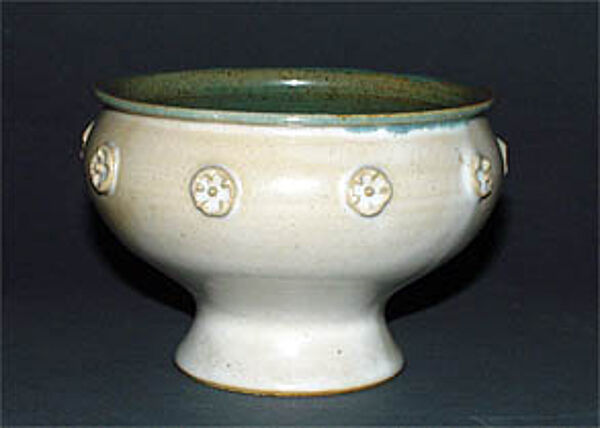 Gebauchter Korpus auf sich nach unten leicht verbreiterndem Fuß, heller Scherben innen grün und außen grau glasiert mit abstrahiertem, spärlichen Blumenapplikationen.