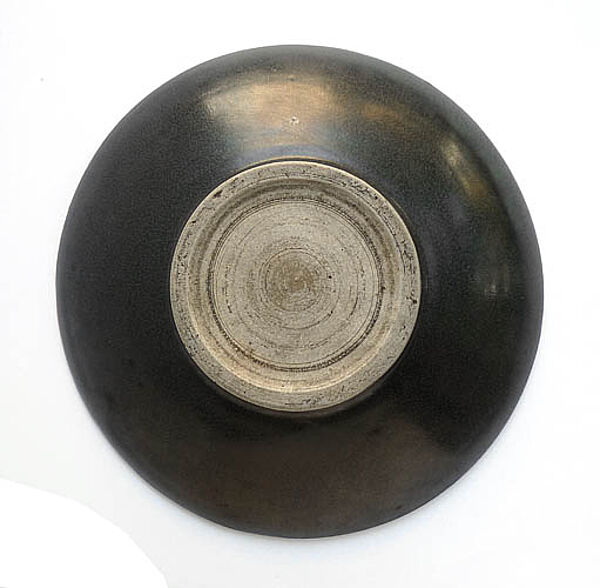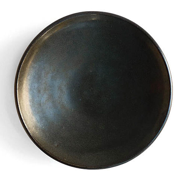 Schalenförmiger Korpus auf flachem Standring. Heller Scherben mit monochrom schwarzer Glasur. Durchmesser ca. 22,5 cm, Höhe ca. 5 cm, moderate Gebrauchsspuren. Ungemarkt, wohl Deutschland der 20er bis 50er Jahre.