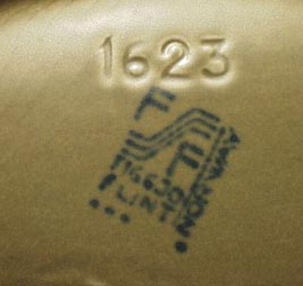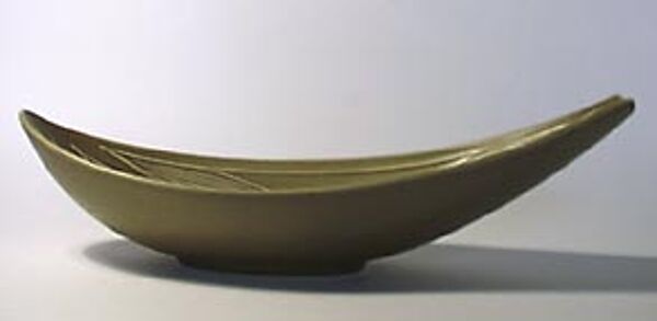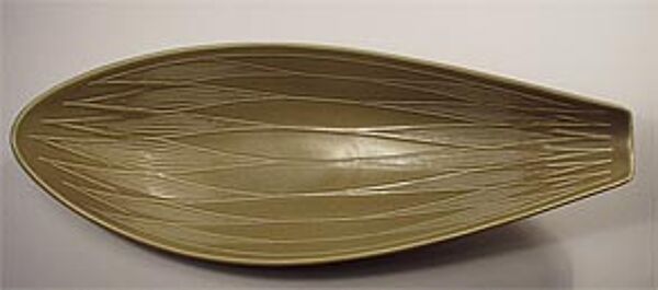 Länglicher, fast kahnförmiger, leicht asymmetrischer Korpus mit konvexen Längsseiten. Das eine Schalenende ist etwas höher gezogen und weist eine kurze, gerade und das andere Ende eine abgerundete Begrenzung auf. Heller Scherben mit olivgrüner Glasur, innenseitig Dekor aus sich überschneidenden Linien. Länge ca. 34,5 cm, Breite ca. 13 cm, Höhe ca. 4,5 cm, minimale Gebrauchsspuren. Unterseitig gemarkt sowie geprägte Form- oder Dekor-Nr. "1623", wohl 50er Jahre.