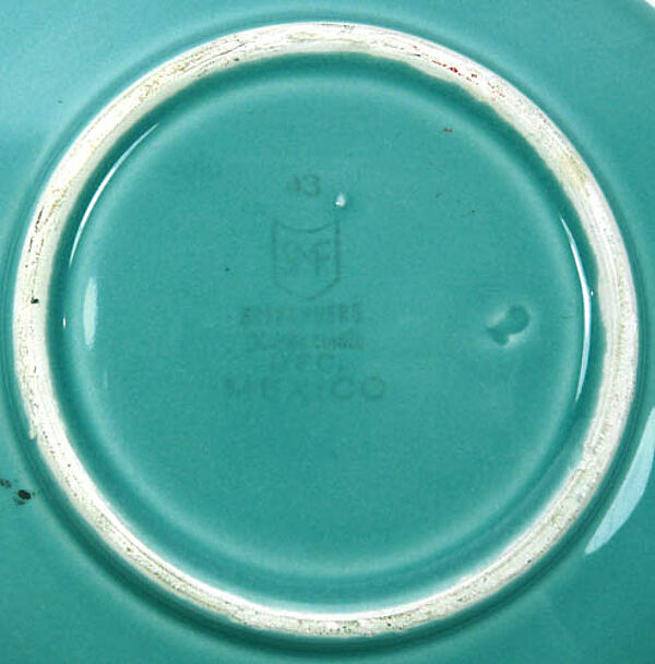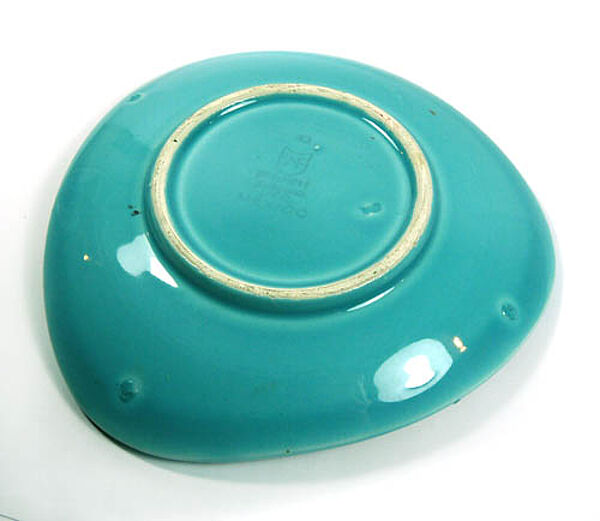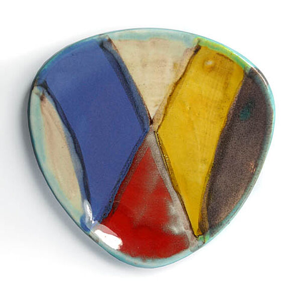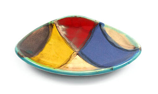 Flach schalenförmiger, in der Grundform annähernd dreieckiger Korpus aus hellem Scherben. Unterseitig monochrom türkis, oberseitig polychrom glasiert, wobei Rot- Beige-, Braun, Blau- und Gelbtöne in angedeutet dreieckigen und rhombenförmigen Feldern zueinander kontrastieren. Maße ca. 15,5 x 15,5 cm, geringe Altersspuren. Unterseitig gemarkt, wohl 50er Jahre.