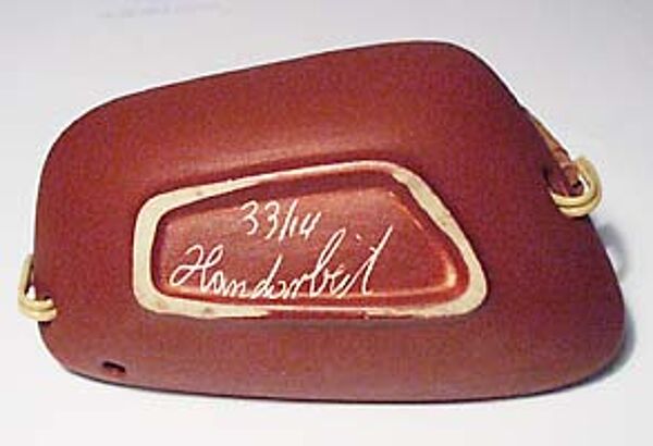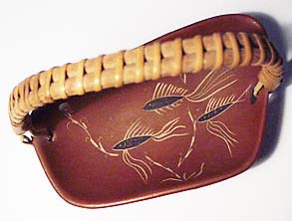 In der Grundform viereckiger, flach schalenförmiger Korpus. Heller Scherben, braun engobiert. Geritztes Fisch-Dekor, teilweise schwarz akzentuiert. Geflochtener Korbhenkel, dieser vermutlich nicht original, aber wohl aus der Zeit (es sind drei Löcher im Korpus für die Handhabe, aber nur zwei sind vom Henkel belegt). L. ca. 14,5 cm, H. ca. 12 cm. Unterseitig bezeichnet mit "Handarbeit" und (Modell?)Nr. 33/14. Wohl Deutschland der 50er / 60er Jahre.