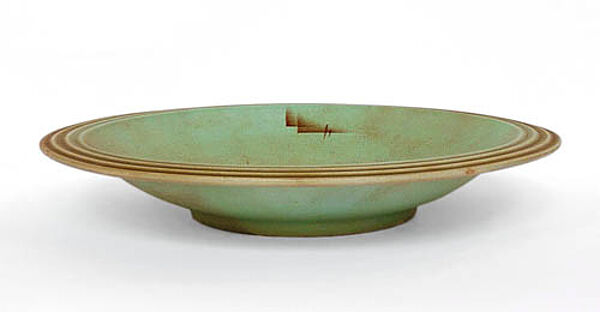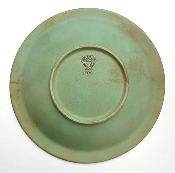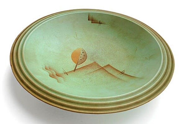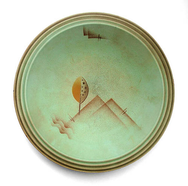 Schalenförmiger Korpus mit leicht ausgestelltem, dreifach gerillten Rand. Heller Scherben mit hellgrüner Grundglasur. Oberseitig polychrom gespritze bzw. schablonierte, stark stilisierte bzw. abstrahierte Darstellung einer bergigen Landschaft mit Baum, im Vordergrund zudem angedeutete Wellen. Durchmesser ca. 29 cm, Höhe ca. 5 cm, es zeigen sich Gebrauchsspuren, insbesondere am Schalengrund eine deutlichere Alterscraquelierung und ein kaum sichtbarer, ca. 2 cm langer, kaum wahrnehmbarer Haarriß am Rand. Unterseitig Markung und Form-Nr. "7700", wohl 20er Jahre.