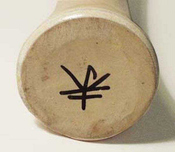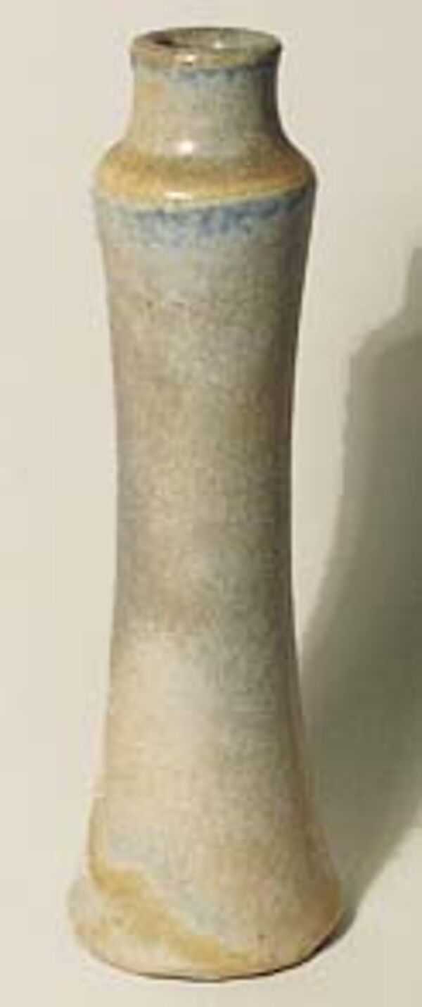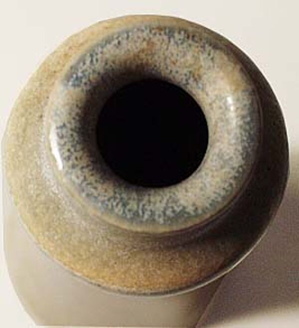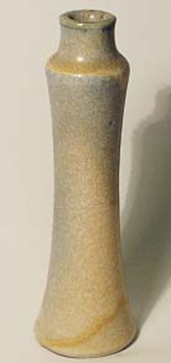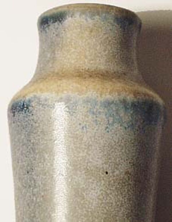 Langgestreckter Korpus mit flach-konkaver Taille sowie kurzem, abgesetzten Hals bzw. leicht betontem Mündungsrand. Heller Scherben mit überwiegend beiger Glasur, es finden sich sparsam hellblaue bzw. gelbe Sprenkelungen im Schulter- und Mündungsbereich. Höhe ca. 17,5 cm, geringe Gebrauchsspuren. Unterseitig gemarkt, wohl 70er Jahre.