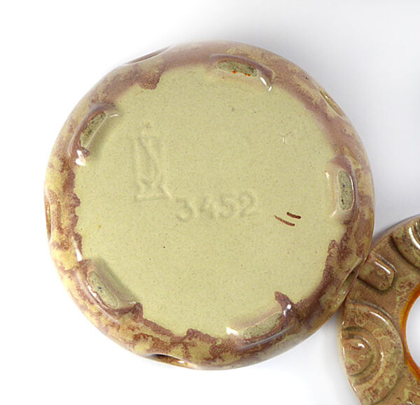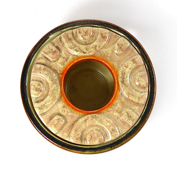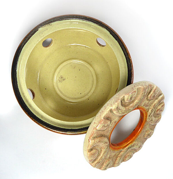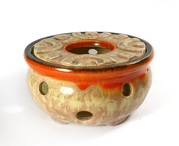 Kapselartiger Keramikkorpus aus hellem Scherben, der auf 5 flachen, stegartigen Füßen steht. Im flach gewölbten Randbereich befinden sich 5 Belüftungslöcher. Scheibenförmiger, mittig gelochter, oberseitig reliefierter Deckel mit Kreissegment-Dekor. Außen überwiegend beige-hellbraune, im Randbereich partiell leuchtend uranrote Glasur. Innen monochrom hellgelb glasiert. Durchmesser ca. 14 cm, Höhe ca. 7 cm, geringe Alters- und Gebrauchsspuren. Unterseitig Markung, wohl 1920er, 30er Jahre.