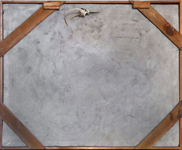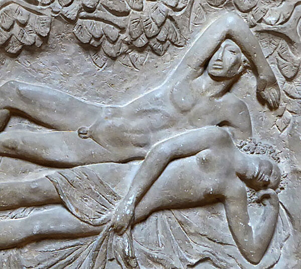 Quer-rechteckiger, tafelartiger, grau gefasster Stukko-Korpus. Vorderseitig Halbrelief eines schlafenden Paares unter Blättern. Gerahmt mit einer einfachen Holzleiste. Maße ca. 73,5 x 59 cm, geringe Altersspuren, so zeigen sich vereinzelt kleine Oberflächenläsuren. Rechts unten signiert, wohl 1930er bis 50er Jahre.