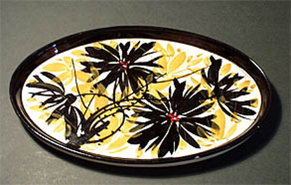 Ovale Form, expressive bzw. farblich kontrastierende Blumenbemalung, heller Scherben. L: 23 cm, B: 14 cm. Am Rand des Tablettes zwei kleine Chips. Gemarkt, wohl Mitte der 20er Jahre.