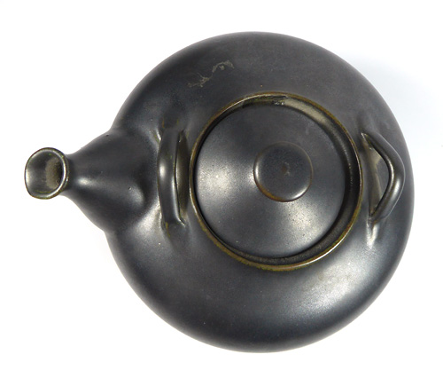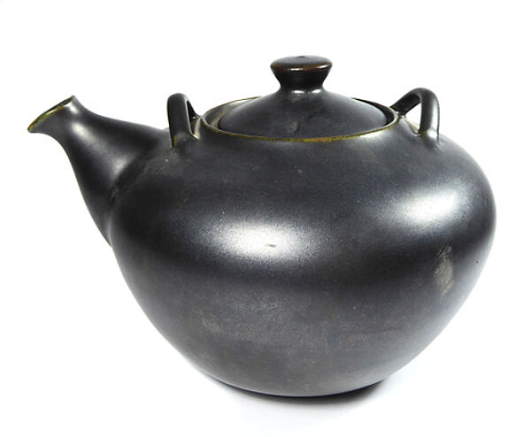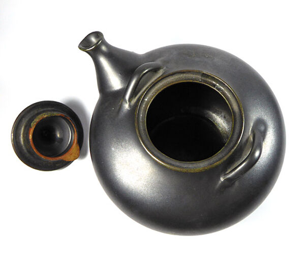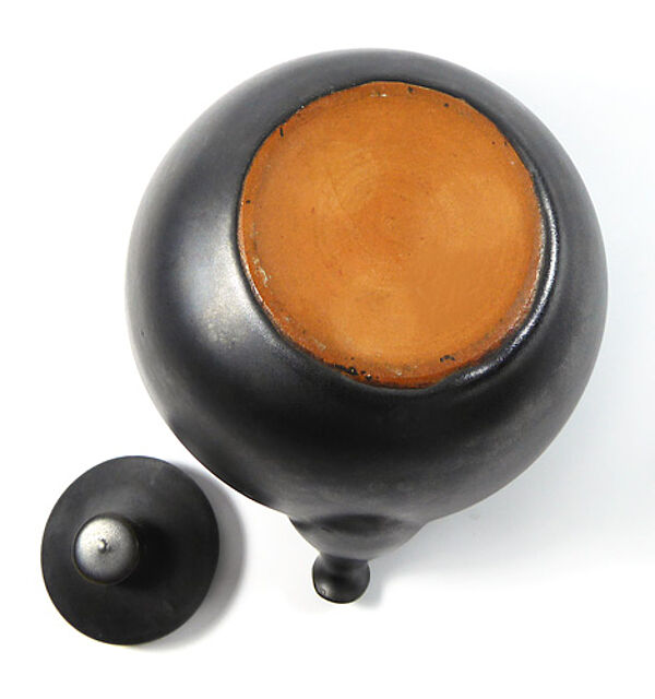 Gebauchter Korpus aus rötlich-braunem Scherben, monochrom schwarz glasiert. Höhe ohne Henkel ca. 10,5 cm, geringe Gebrauchsspuren, Basthenkel fehlt. Ungemarkt, wohl Deutschland der 1930er bis 50er Jahre.