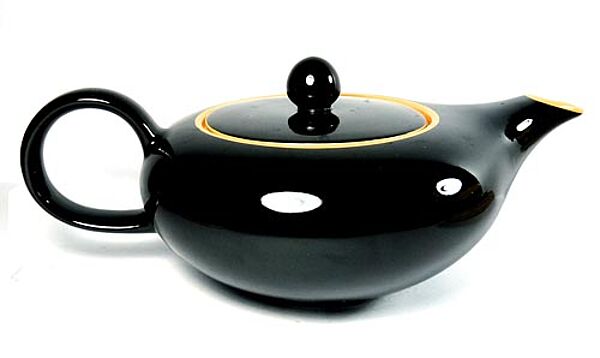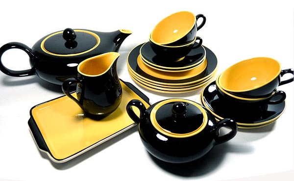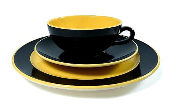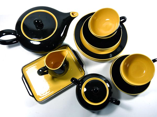 Teeservice, bestehend aus 4 Gedecken (Tellerdurchmesser ja ca. 19,2 cm), Teekanne, Milchkännchen, Zuckerdose, kleines Tablett für Gebäck. Heller Scherben, innen leuchtend gelb, außen schwarz glasiert. Geringe Gebrauchsspuren. Nicht alle Teile, aber Teller durchweg gemarkt, wohl 30er Jahre.