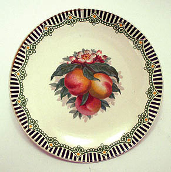 Obst- oder Zierteller, im Randbereich geometrisches Dekor, zentral Pfirsichmotiv, D. ca. 20cm. Bereibung des Goldrandes. Unterseitig gemarkt, wohl um 1910/15.