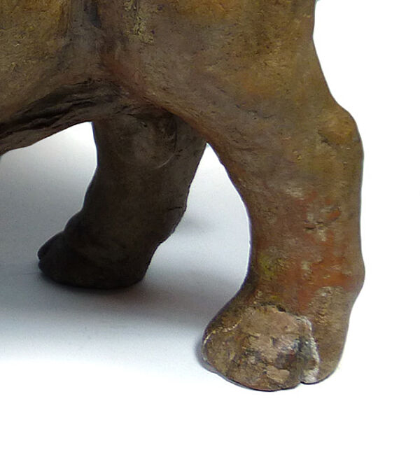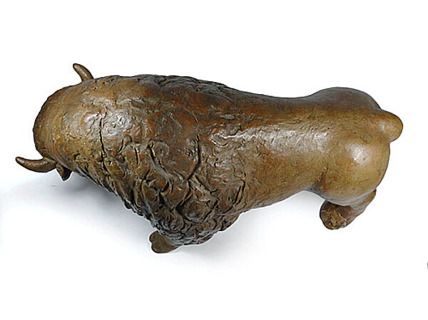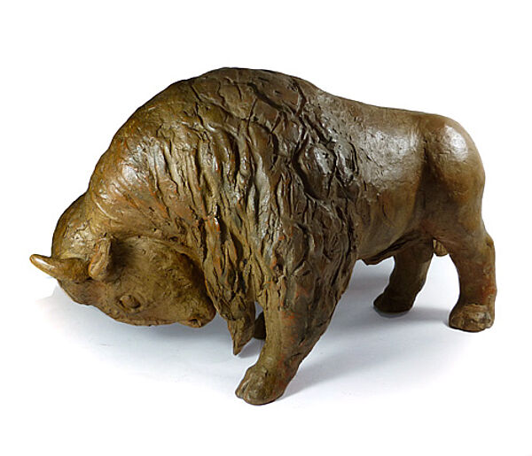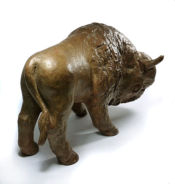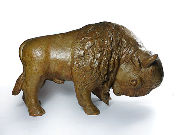 Vollplastischer Korpus eines Büffels aus rotem Scherben, braune Mattglasur, unterseitig geritzte Signatur. Höhe ca. 26 cm, Länge ca. 42 cm, es zeigen sich einige diskrete Bestoßungen sowie ein kleiner geklebter Abschlag am linken Hinterfuß. Die Plastik dürfte 1948 entstanden sein, siehe hierzu Ausstellungsheft der staatl. Kunstsammlungen Dresden von 1948.