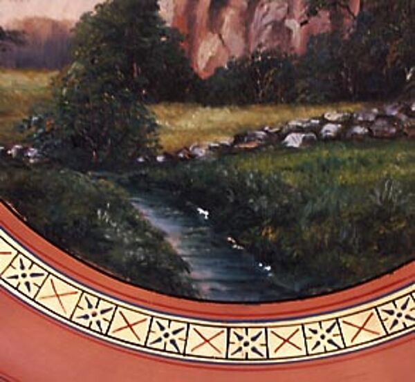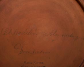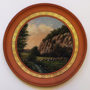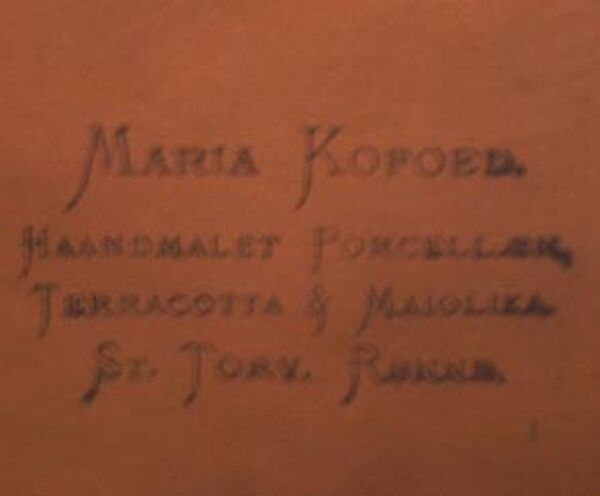 Flach-schalenförmiger Korpus mit kleinem, ausgestellten Rand aus hellbraunem Scherben, vorderseitig handgemalte Felsenlandschaft auf Bornholm: "Almindingen" (Ölmalerei), eingerahmt von einem goldenen, einfach gemusterten Band. Durchmesser ca. 34,5 cm, geringe Gebrauchsspuren. Rückseitig bezeichnet "Maria Kofoed - haandmalet Porcellan, Terracotta & Majolika - Sr. Toerv. Roenne". Evtl. um 1900 bis 1915. Erinnert an die frühen Stücke von Hjorth, evtl. war Maria Kofoed auch eine ehemalige Angestellte von Hjorth?