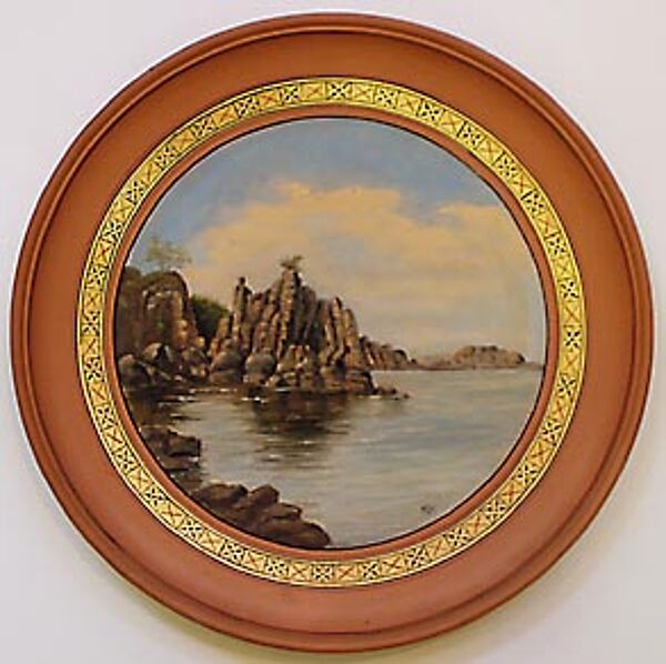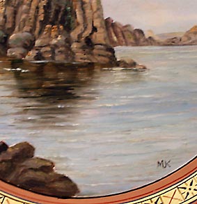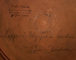 Flach-schalenförmiger Korpus mit kleinem, ausgestellten Rand aus hellbraunem Scherben, vorderseitig handgemalte Küstenlandschaft auf Bornholm: "Lippertsklippen Bornholm" (Ölmalerei), eingerahmt von einem goldenen, einfach gemusterten Band. Monogrammiert. Durchmesser ca. 34,5 cm, geringe Gebrauchsspuren. Rückseitig u.a. bezeichnet "Maria Kofoed - haandmalet Porcellan, Terracotta & Majolika - Sr. Torv. Roenne". Evtl. um 1900 bis 1915. Erinnert an die frühen Stücke von Hjorth, evtl. war Maria Kofoed auch eine ehemalige Angestellte von Hjorth?
