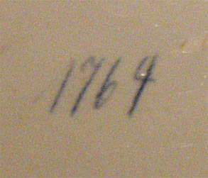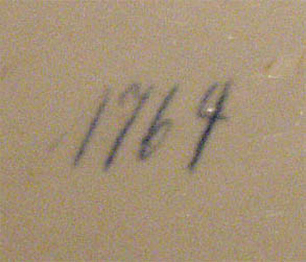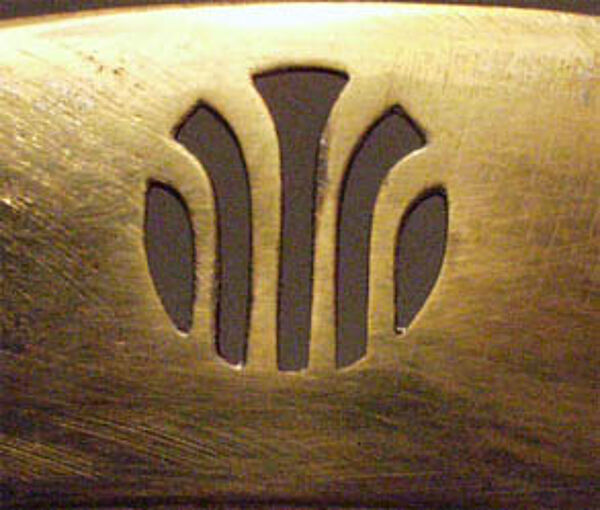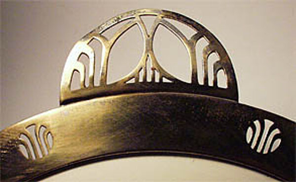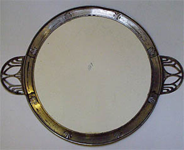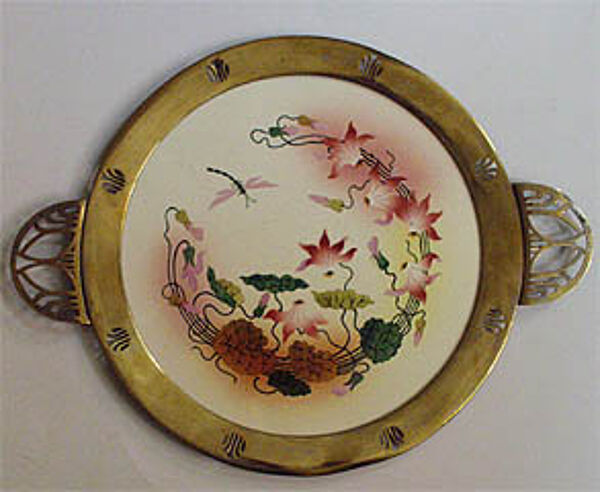 Runde Keramikplatte mit floralen Motiven, an japanische Formensprache erinnernd. Außen Metallfassung aus Messing sowie zwei filigrane Handhaben. Maße: Durchmesser: ca. 36 cm, Metallrand ca. 3,5 cm. Insbesondere am Metall zeigen sich deutlichere Bereibungen, z.T. auch leichtere Verbiegungen (vermutlich bestand ursprünglich eine Versilberung), auf der Keramikplatte sind Kratzer auszumachen. Unterseitig bezeichnet mit "1764". Wohl Deutschland um 1905.