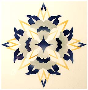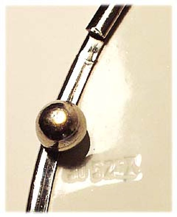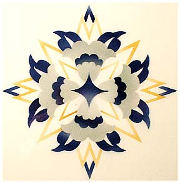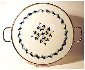Runde Keramikplatte mit vernickelter Metalleinfassung, die auf drei Kugelfüßen steht, seitlich befinden sich zwei Handhaben. Durchmesser ca. 30 cm. Zentral befindet sich ein polychromes, stilisiertes florales Motiv (Spritzdekor), peripher ein Zierkranz. Das Stück weist nur geringfügige Alterungsspuren auf. Unterseitig diverse Form- oder Dekor-Nummern, siehe Foto. Ungemarkt, evtl. handelt es sich um eine Keramik von Theodor Paetsch aus den 20er Jahren.