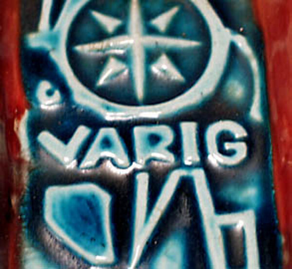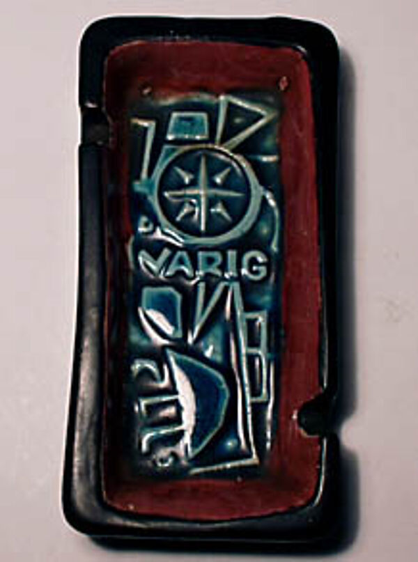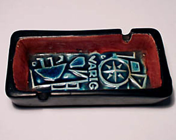 Aschenbecher der Fluglinie Varig-Brasil. Rötlicher Scherben, weinrote, türkise und schwarze Glasur. Im Boden stilisierte bzw. abstrahierte Motive, u.a. ist auch ein Kompass zu erkennen. L. 15cm, sehr guter Zustand, wohl 50er Jahre.