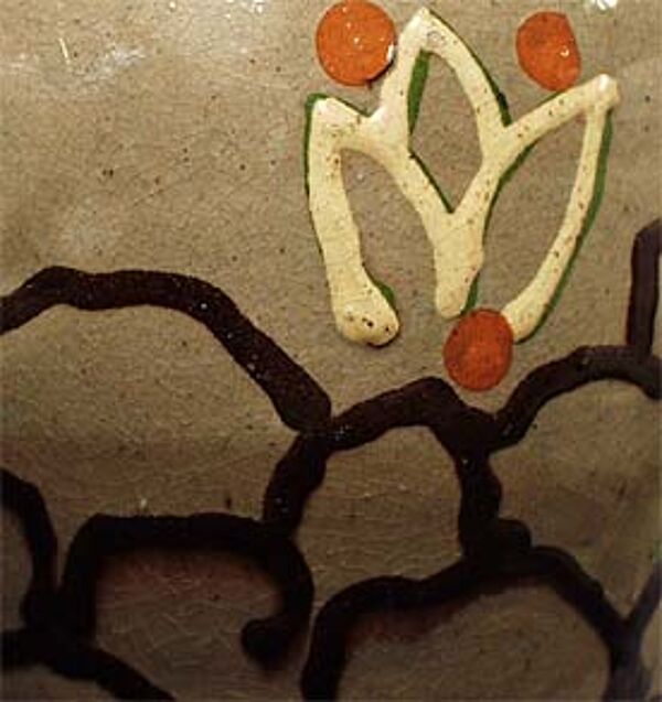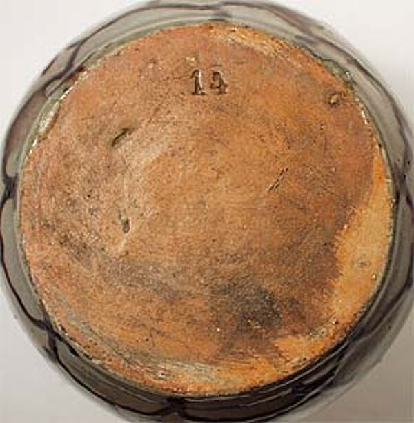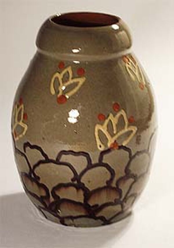 Ovoider Korpus mit kompaktem, konusartig abgesetzen Mündungsrand. Bräunlicher Scherben mit braun-grüner Glasur, geschlickertes, stilisiert-florales Dekor in schwarz, weiss und orange. Höhe ca. 17 cm, Durchmesser der Öffnung ca. 5,5 cm. Insgesamt geringe Gebrauchsspuren (kleine Glasurfehlstelle). Ungemarkt, unterseitig bezeichnet mit "14", wohl Deutschland oder Österreich um 1905/10.