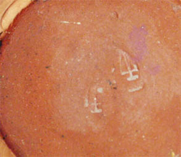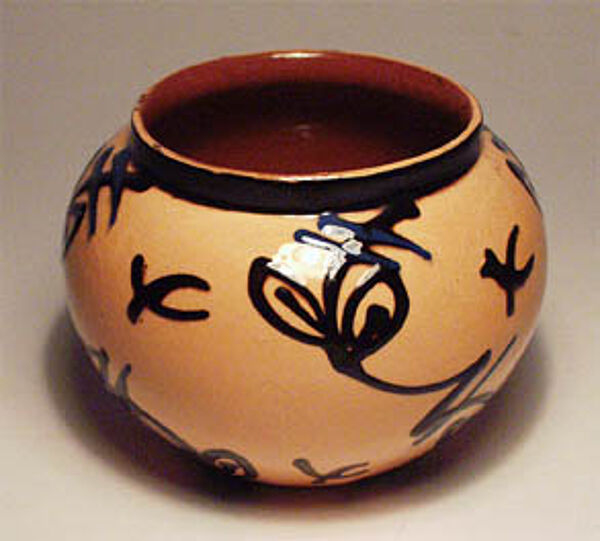 Kugelförmiger Korpus aus rötlich-braunem Scherben mit beiger Glasur und schwarzem, abstrahiert-floralen Dekor. Höhe ca. 9 cm, Durchmesser ca. 12 cm; geringe Gebrauchsspuren. Unsigniert, unterseitig zweimal mit der (Form- oder Dekor-)Nummer "4" bezeichnet. Wohl Deutschland oder Österreich um 1920.