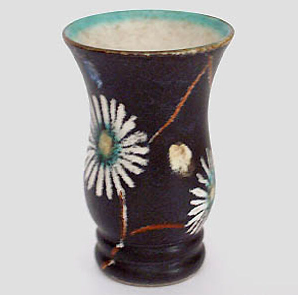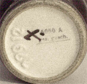 beiger Scherben, anthrazitfarben, in Ausspartechnik gestaltete Blütenmotive, H.12cm, innen leichte Craquelierung, Künstlersignatur(ungedeutet), Modell-Nr., 6050 A ges.gesch., 60er/70er Jahre