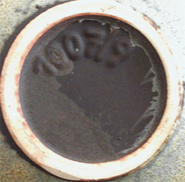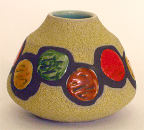 Gedrungener, stark gebauchter Korpus aus hellem Scherben, matt-gelbe, rauhe Glasur mit einer umlaufenden Reihe leuchtend farbiger, schwarz unterlegter Scheiben-Elemente. Höhe ca. 9 cm, geringe Gebrauchs- und Altersspuren. Ungemarkt, unterseitig Form- oder Modellnr. "1007/9", wohl Deutschland der 1950er Jahre.
