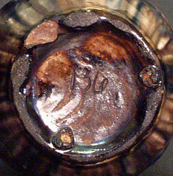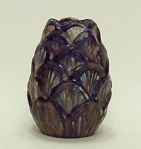 Flach gebauchter, annähernd ovoider Korpus mit schupenartig geformter Oberfläche, heller rötlicher Scherben mit Laufglasur in Braun-, Blau und Grüntönen, insgesamt expressiv wirkendes Stück. Höhe ca. 14,5 cm. Unterseitig gemarkt, hier auch im Randbereich etwas größerer Chip, sowie Abrißspuren der nach unten gelaufenen Glasur (2. Wahl?). Wohl 20er Jahre.