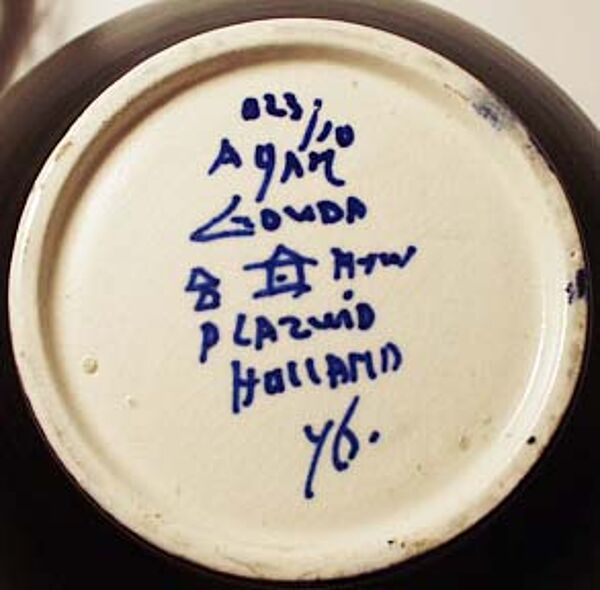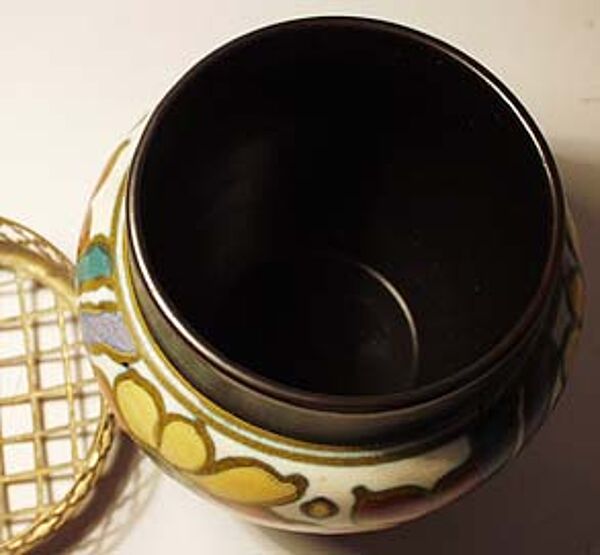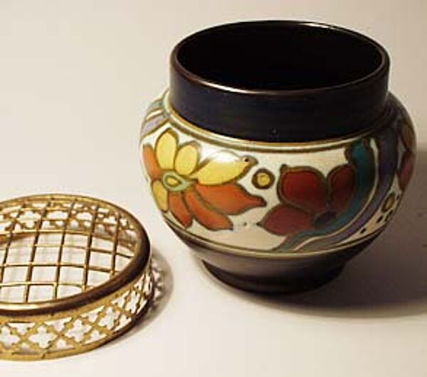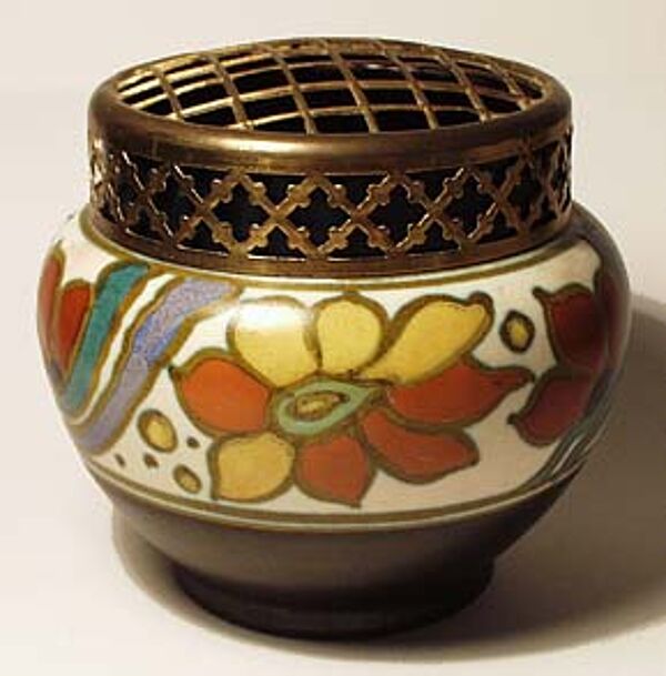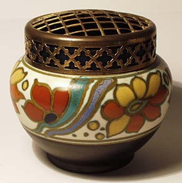 Gebauchter Korpus mit breitem, zylindrischen Mündungsrand aus hellem Scherben mit polychromem, stilisiert-floralen Dekor. Innenseitig dunkelbraune Glasur. Gitterförmig durchbrochener Messingdeckel mit Patina. Höhe ca. 13 cm. Unterseitig gemarkt (ab 1930) sowie mehrere Bezeichnungen, siehe Foto.