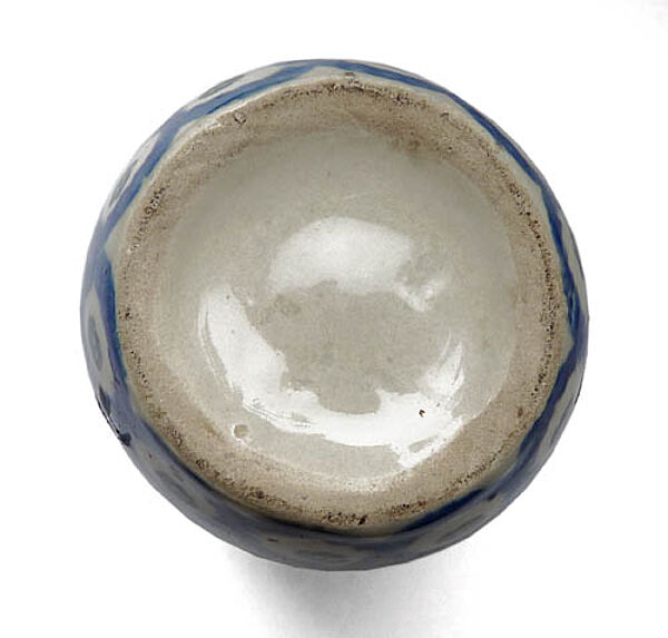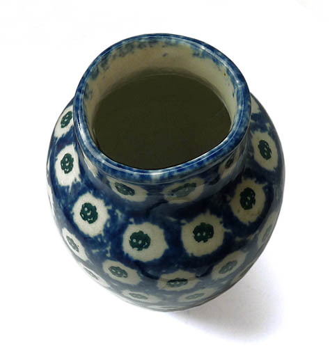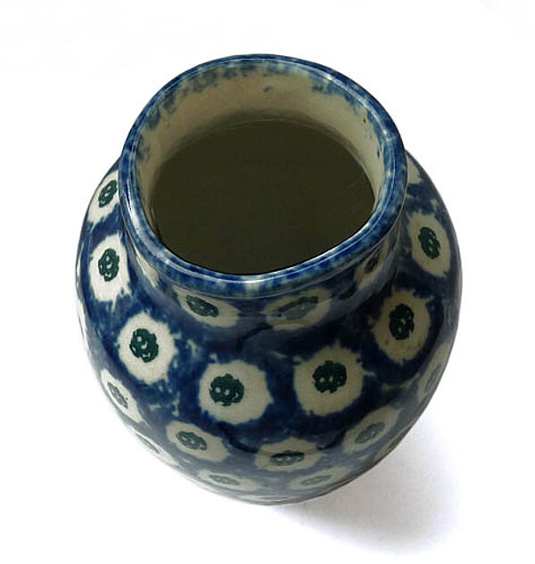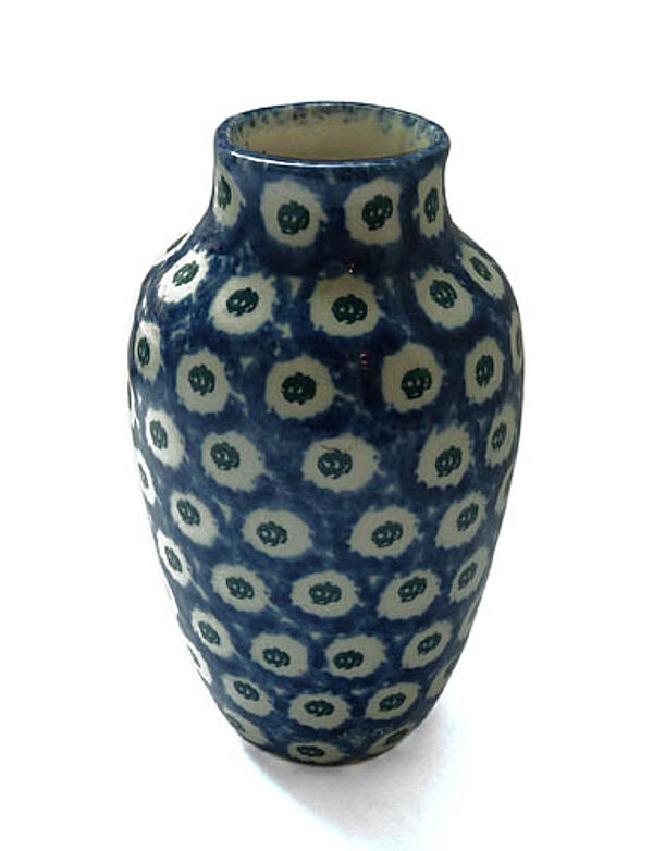 Zur Schulter zu leicht gebauchter Korpus mit abgesetztem, zylindrischen Halsbereich. Heller Scherben mit geschwämmeltem und getupften Pfauenaugen-Dekor in Blau, Weiß und Dunkelgrün. Höhe ca. 20 cm, geringe Gebrauchsspuren. Ungemarkt, wohl Bunzlau der 20er, 30er Jahre.