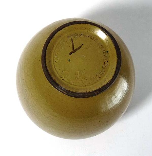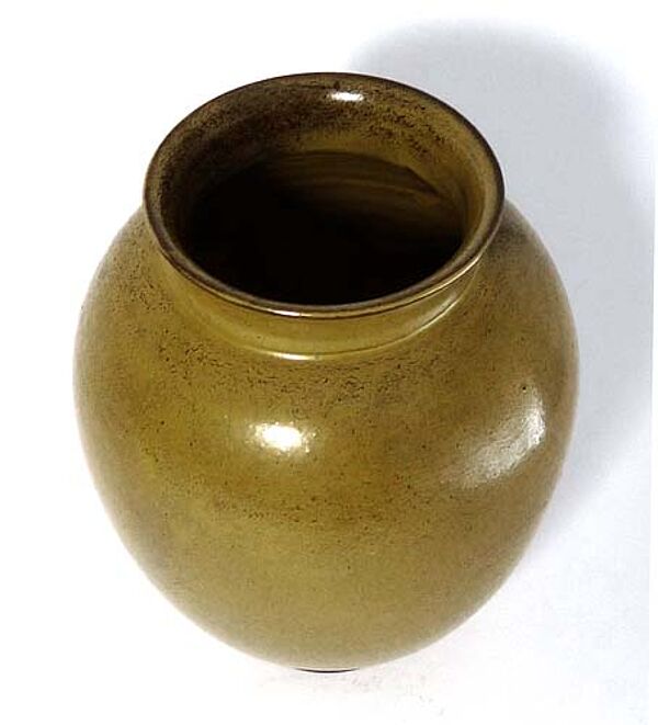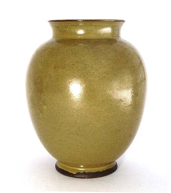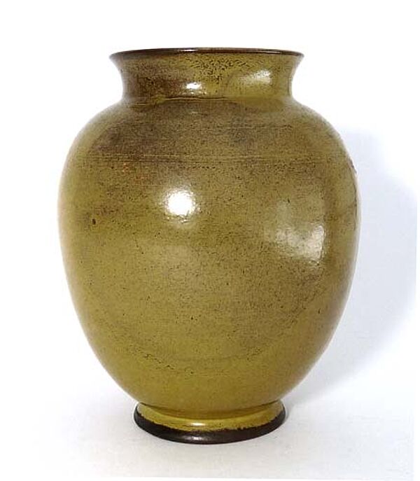Ovoider Keramikkorus auf kleinem Standring mit steil ausgestelltem Mündungsrand. Brauner Scherben mit gelblich-bräunlicher Glasur. Höhe ca. 17 cm; professionell restaurierter Chip am Mündungsrand, ansonsten nur minimale Gebrauchsspuren. Unterseitig Markung sowie Modell-Nr. "D96". Wohl 30er Jahre.