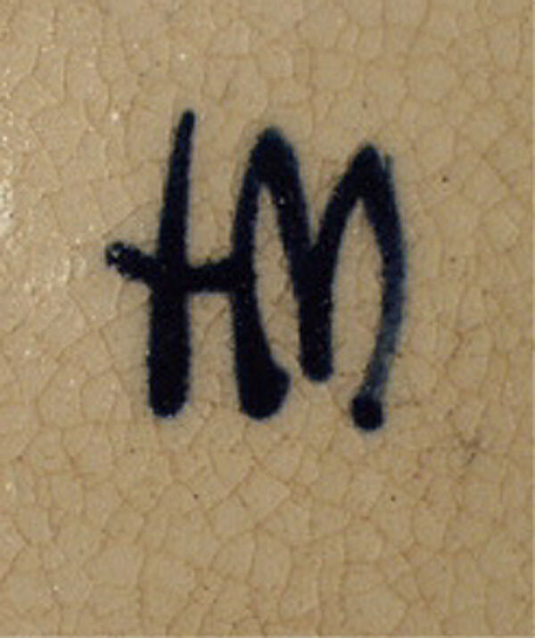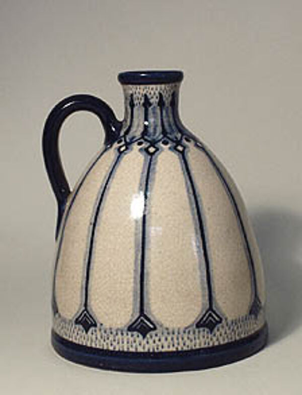 Glockenförmiger Korpus mit schlanker Mündung und an der Schulter abgehender Handhabe. Heller Scherben, überwiegend helle, fast weiße, fein craquelierte Glasur mit zweitonig blauer, geometrischer Akzentuierung. H.: ca. 17 cm, gemarkt "HM" (= Heinz Meier), ca. 60er Jahre.