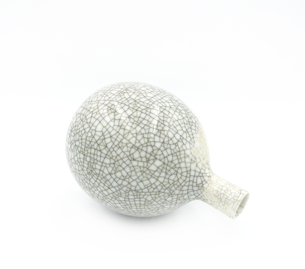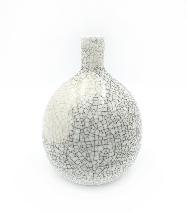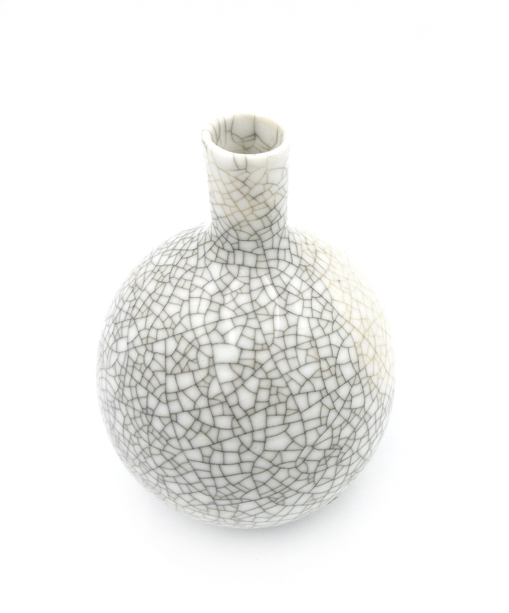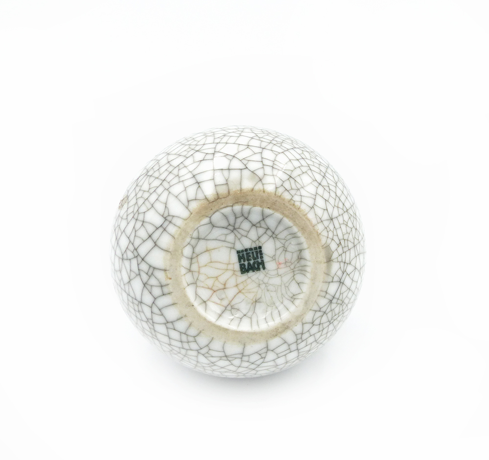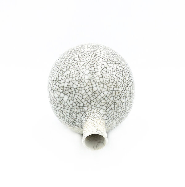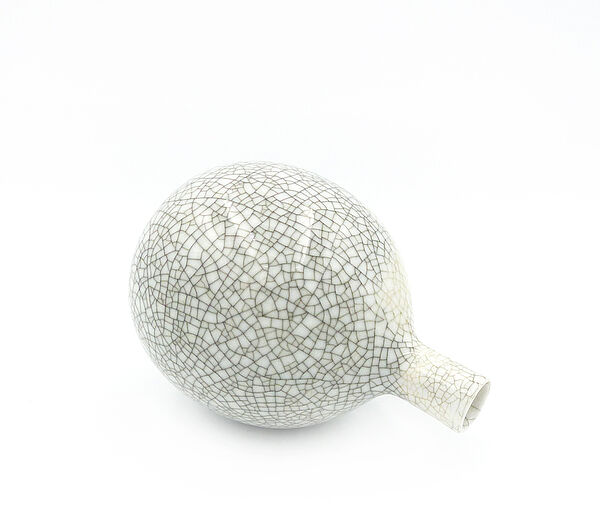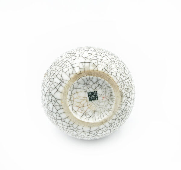 Angedeutete Kallebassen-Form: Gebauchter Korpus mit lang gezogenem, relativ schmalen Hals. Heller Scherben mit grau-beiger Craqueleé-Glasur, die fleckförmig deutlich aufgehellt ist, siehe Foto. Höhe: ca. 15 cm; unterseitig gemarkt, wohl 30er Jahre (Marke ab 1910).