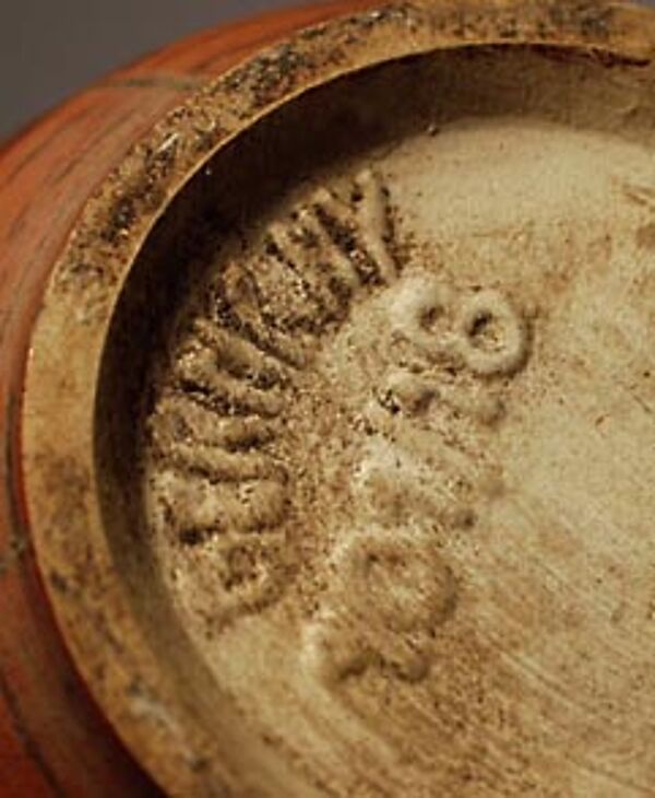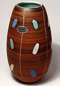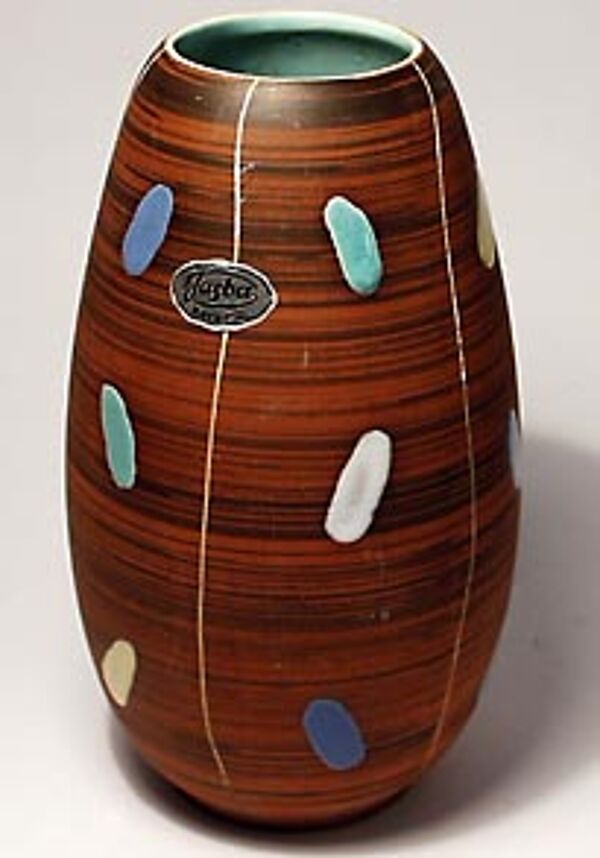Angedeutet ovoider Korpus aus hellbraunem Scherben. In verschiedenen Brauntönen gestreifte Grundglasur, die durch vertikale weiße Streifen in längliche Felder untergliedert wird. Hier sind jeweils drei unterschiedlich farbige Glasurtupfer untereinander angeordnet. Höhe ca. 18 cm, geringe Gebrauchs- und Altersspuren. Gemarkt mit silberfarbenen Aufkleber an der Wandung, unterseitig bezeichnet mit "Germany" sowie Form- oder Modell-Nr. "101/18", wohl 1950er Jahre.