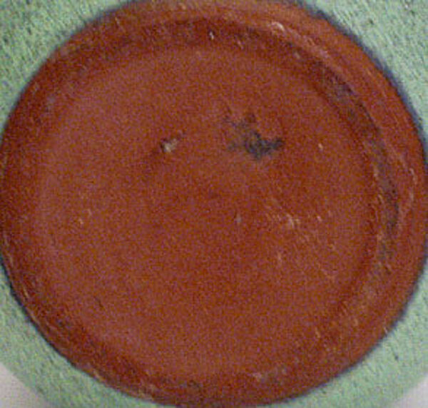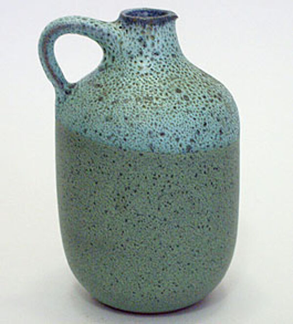 Länglicher im Mittelbereich gebauchter Korpus mit enger Mündung und eingezogenem Stand. Rötlicher Scherben mit gesprenkelter Glasur in Grüntönen. Höhe ca. 12,5 cm. Unterseitg gemarkt, wohl 50er Jahre.