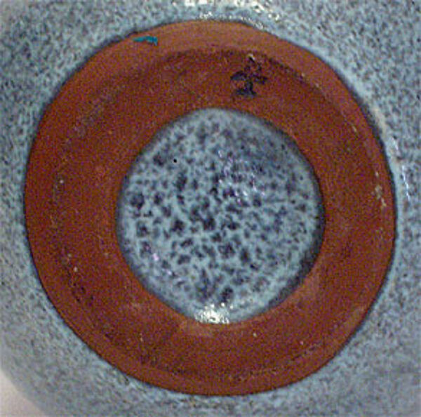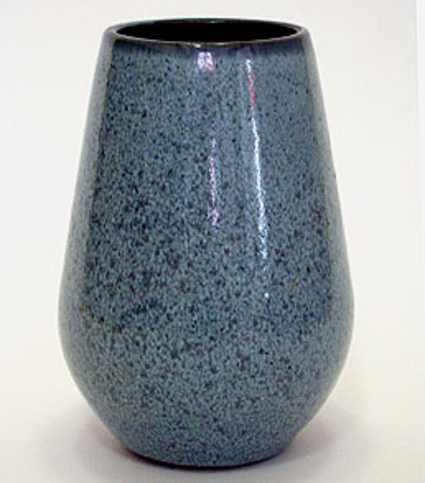 Länglicher, im unteren Drittel leicht gebauchter Korpus, rötlicher Scherben, graublaue, in Blautönrn gesprenkelte Glasur. Höhe ca. 15 cm, unterseitig gemarkt, wohl 60er Jahre.