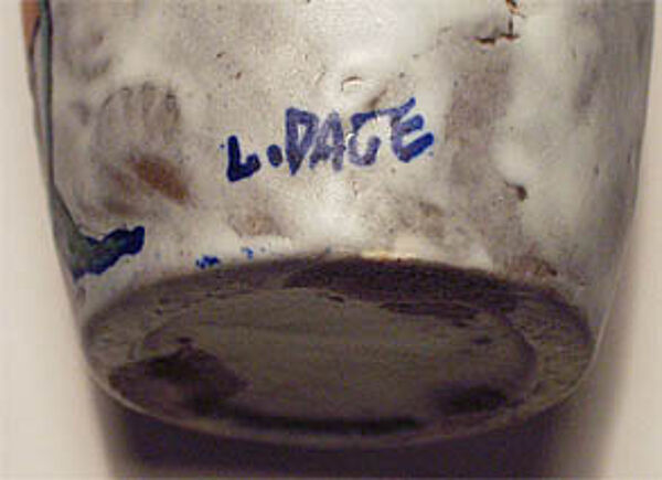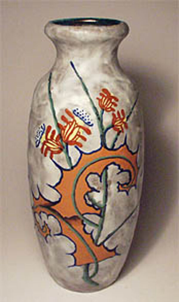 Langgestreckter, flach-gebauchter Korpus, akzentuierte Halskehle, betonter Mündungsrand. Höhe ca. 25 cm. Brauner Scherben mit heller, leicht transparenter, ungleichmäßiger Grundglasur. Polychromes, stilisiertes Disteldekor. Oberhalb des Stand signiert mit "L. Dage". Frankreich, wohl um 1925.