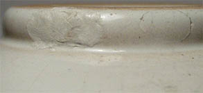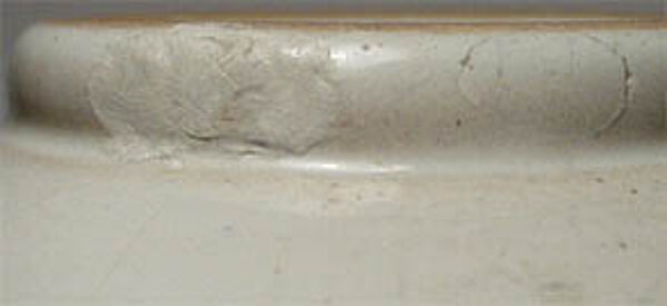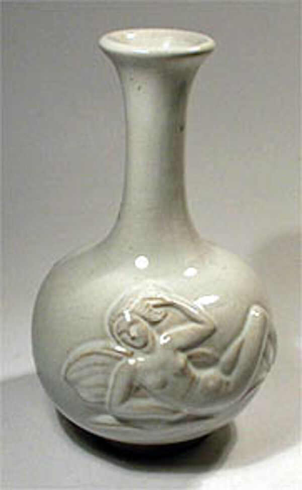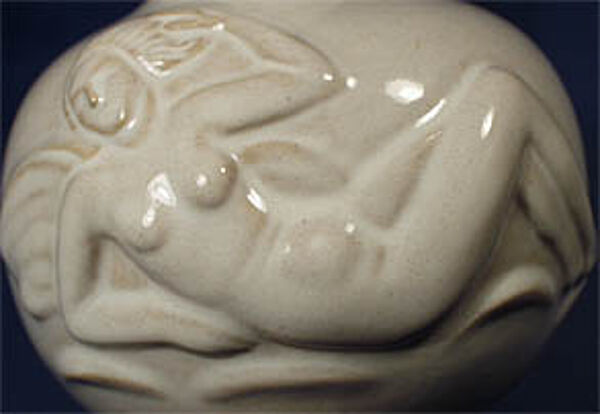 Vase mit langem, flach tailliertem Hals. Relief zweimal Akte am Strand mit Flügeln, evtl. mythische Wesen ? Hellbrauner Scherben. Am Stand 2 x restauriert (s. Detailfoto), insgesamt aber wenig störend, sonst guter Zustand. H.: 21 cm, D.: 14 cm. Gemarkt mit Fischstempel als Relief - Marke zwischen 1930 und 1950.