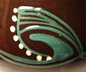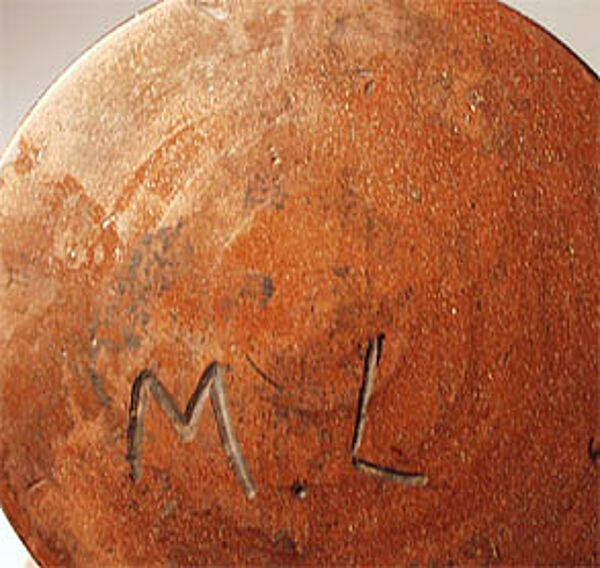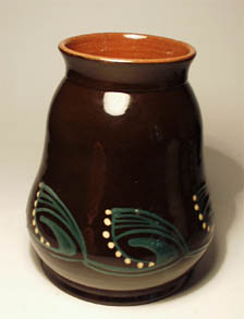 Im unteren Bereich leicht gebauchter, im oberen Anteil konisch sich verjüngender Korpus mit ausgestelltem Mündungsrand. Rötlich-brauner Scherben mit außenseitig dunkelbrauner Glasur und stilisiertem Blattdekor in grün und weiß (Schlickertechnik), innenseitig rötlich-hellbraune Glasur. Höhe ca. 19 cm, Durchmesser der Öffnung: ca. 8,5 cm. Minimale Gebrauchsspuren. Unterseitig geritzt " M. L." (diese Markung wird im Zühlsdorff ab 1929 angegeben).