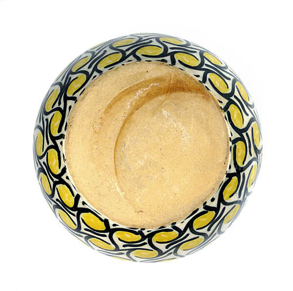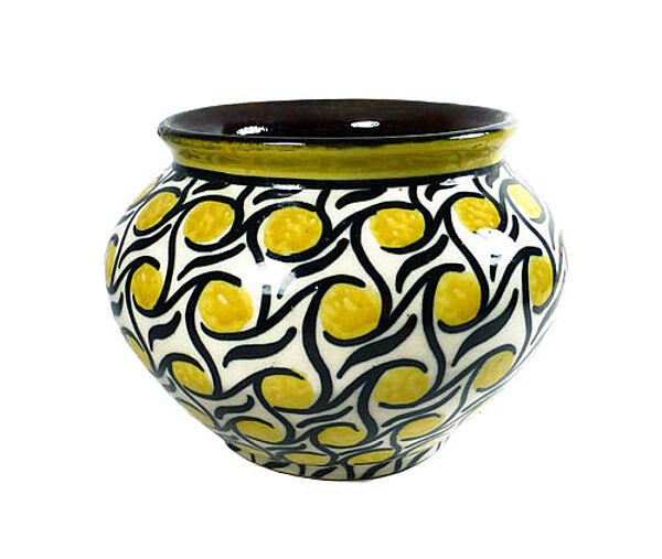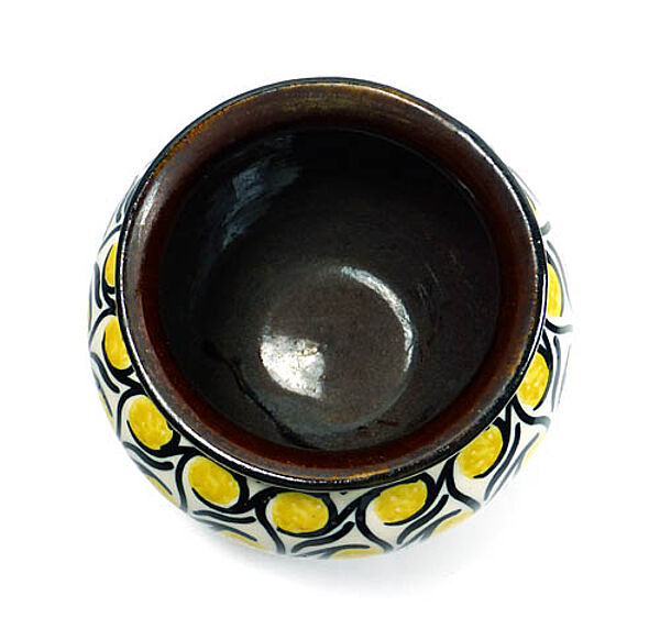 Angedeutet herzförmiger Keramikkorpus aus beigem Scherben mit leicht ausgestelltem Rand, außenseitig handgemaltes, abstraktes Dekor (Schlickermalerei) in schwarz und gelb auf weißem Grund. Innen monochrom dunkelbraun glasiert. Höhe ca. 11 cm, Außendurchmesser ca. 15 cm, geringe Altersspuren. Ungemarkt, wohl Deutschland um 1910.