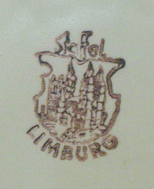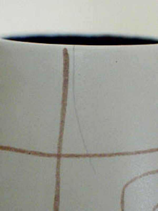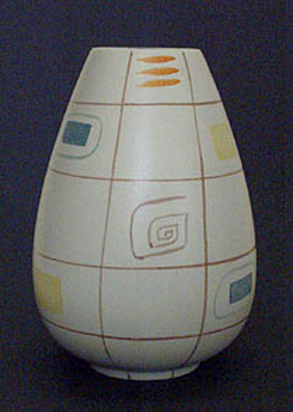 Ovoider Korpus aus hellem Scherben auf leicht eingezogenem Stand. Beige Grundglasur, überzogen mit einem feinen, handgemalten Gitter in Braun, in den freien Feldern schlichtes, zeichenhaftes geometrisches Dekor in verschiedenen Farben. Höhe ca. 17,7cm, feiner Haarriß am Mündungsrand, ansonsten nur minimale Gebrauchsspuren. Unterseitig gemarkt Limburg, 1950er