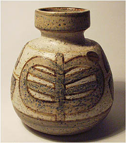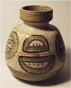 Gewölbter Korpus mit akzentuiertem Hals und ausgestelltem Mündungsrand, heller Scherben mit abstraktem Dekor in beige, braun und blau-grau. H. ca. 15 cm. Unterseitig gemarkt sowie Aufkleber im Randbereich, siehe Fotos. Wohl um 1970.