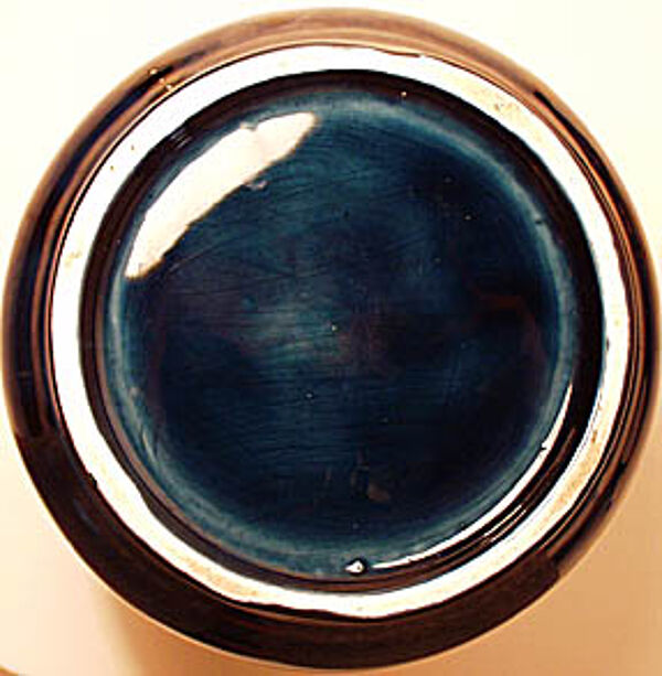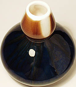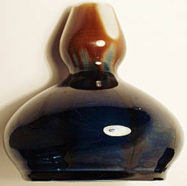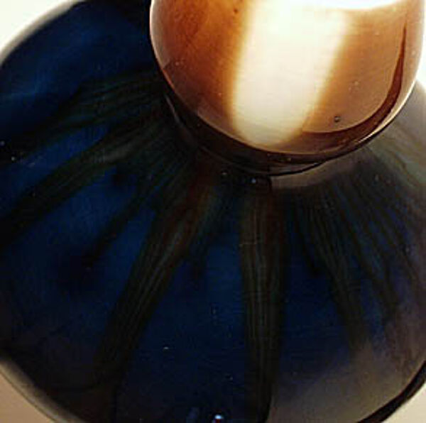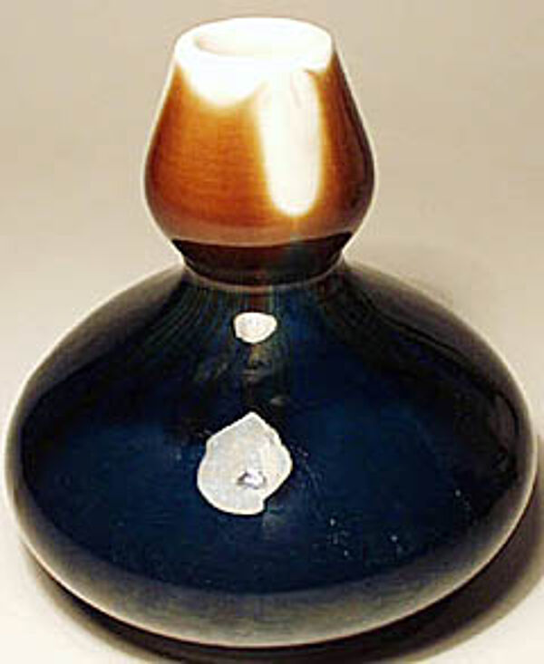 Im unteren Drittel gebauchter, kalebasseartiger Korpus mit lang ausgezogenem, taillierten Halsbereich. Höhe ca. 14 cm, geringe Gebrauchsspuren. An der Mündung beige bzw. fast weiße sowie leuchtend braune, ansonsten tief-blaue Laufglasur. Heller Scherben, Unterseite ebenfalls glasiert. Somit ist die Markung nicht zu erkennen (oder es handelt sich um ein Stück, welches mit einem Papier-Etikett versehen war, die Scharvogel in seiner Münchner Zeit auch verwendet hat). Bzgl. Form und Glasur vergleichbare Stücke sind in der Monografie "Jakob Julius Scharvogel - Keramiker des Jugendstils" (Arnoldsche Verlagsanstalt 1996, siehe Seite 63, 64 und 71) abgebildet, so daß eine Zuordnung zu diesem Künstler sehr wahrscheinlich ist.