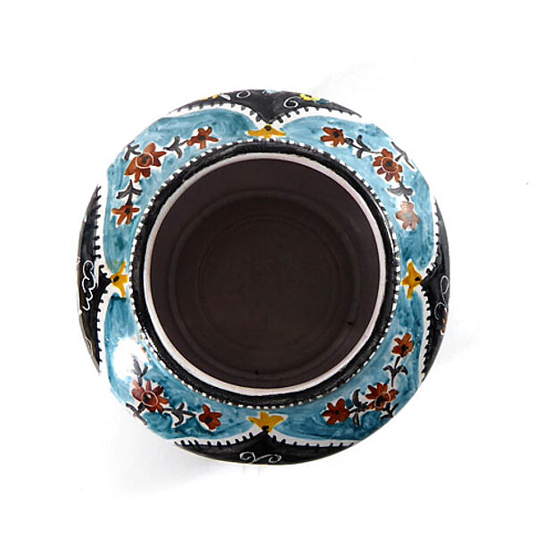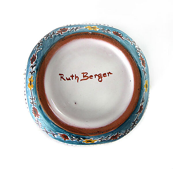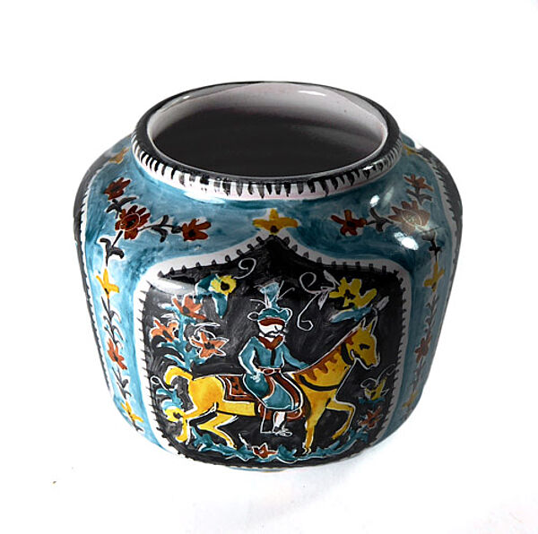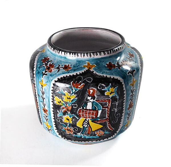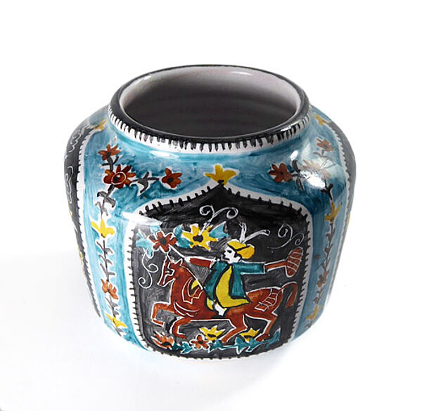 Kapselartig gebauchter Keramikkorpus mit leicht ausgestelltem Rand aus rotbraunem Scherben, außenseitig polychromes, handgemaltes orientalisch-märchenhaftes Dekor. Höhe ca. 7 cm, geringe Altersspuren. Unterseitig signiert (Lebensdaten der Künstlerin nicht bekannt), wohl Deutschland der 1960er, 70er Jahre.