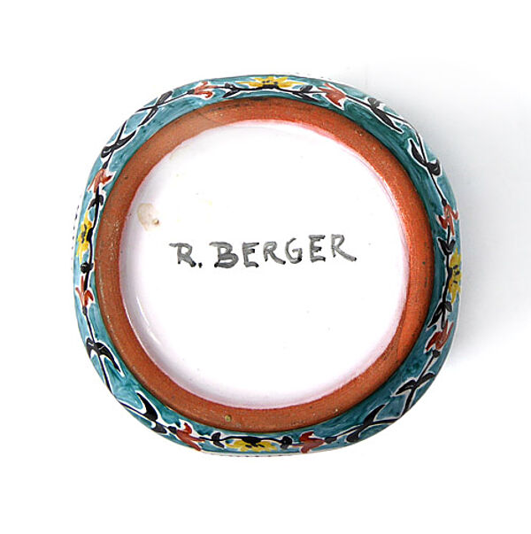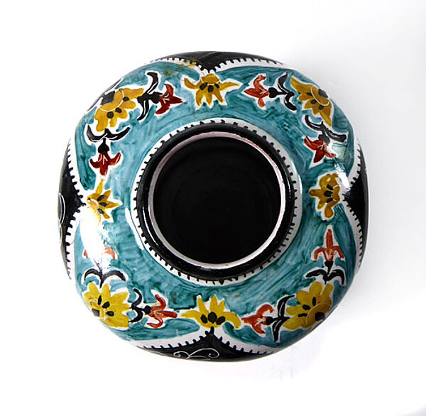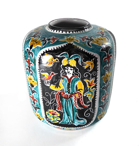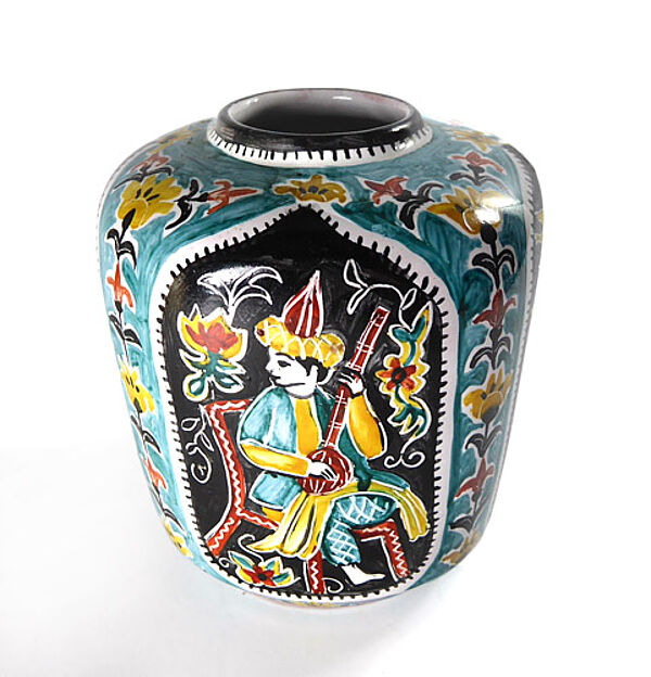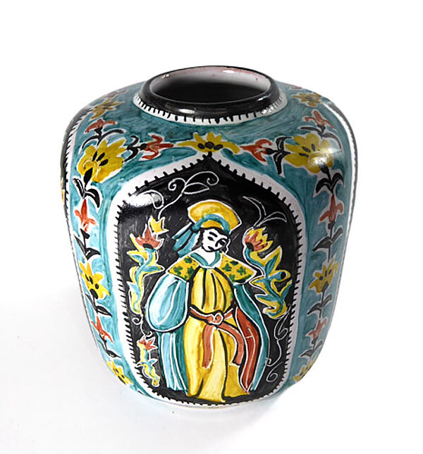 Kapselartig gebauchter Keramikkorpus mit engem, leicht ausgestelltem Rand aus rotbraunem Scherben, außenseitig polychromes, handgemaltes orientalisch-märchenhaftes Dekor. Höhe ca. 10 cm, geringe Altersspuren. Unterseitig signiert (Lebensdaten der Künstlerin nicht bekannt), wohl Deutschland der 1960er, 70er Jahre.