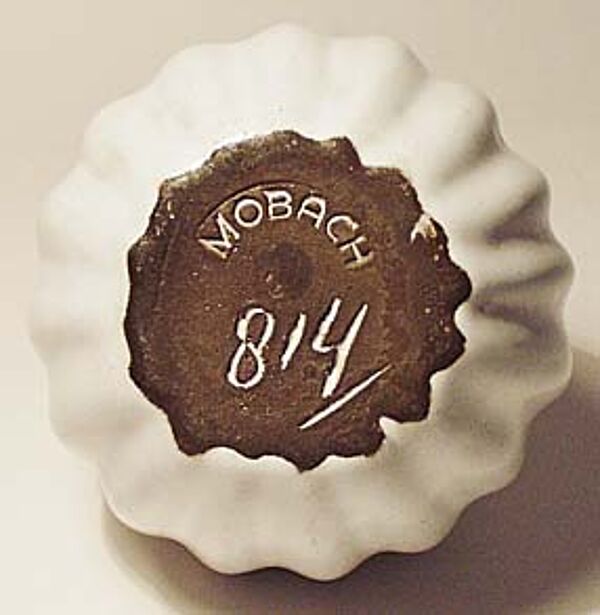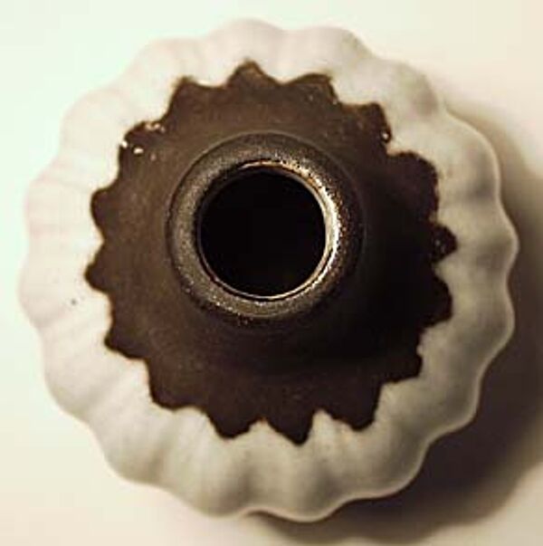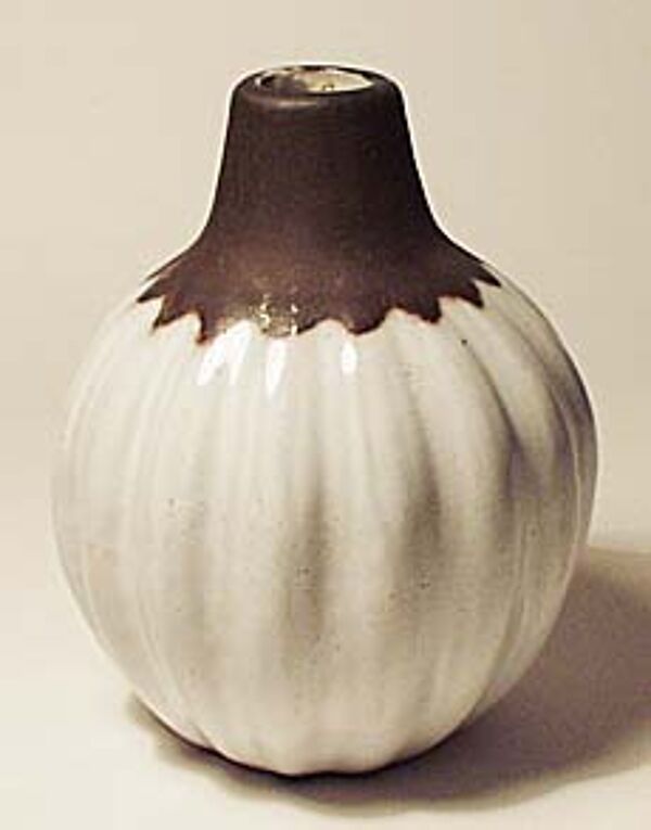 Vase in Kürbis-Form. Brauner Scherben, im Bereich des gerippten Korpus-Bauches weiße Glasur, der lang ausgezogene Hals ist nicht glasiert. Höhe ca. 13,5 cm. Unterseitig gemarkt und bezeichnet mit Dekor- oder Form-Nummer "814", wohl 50er Jahre.