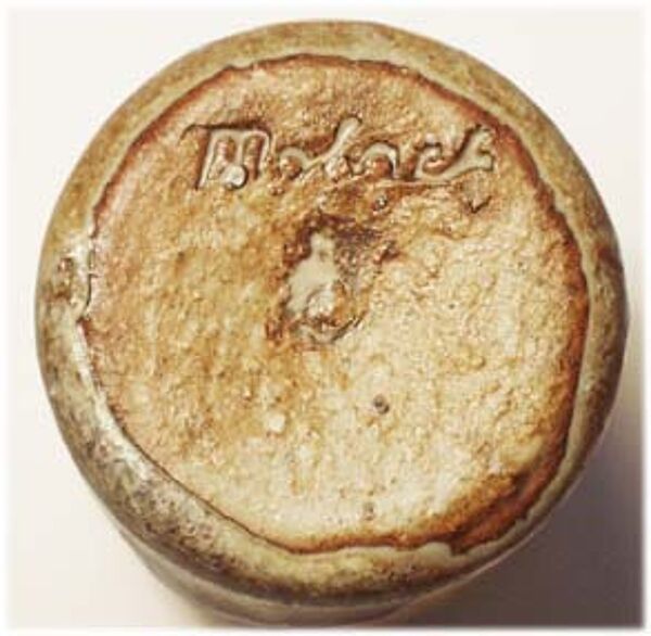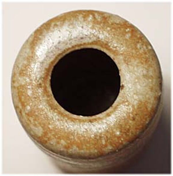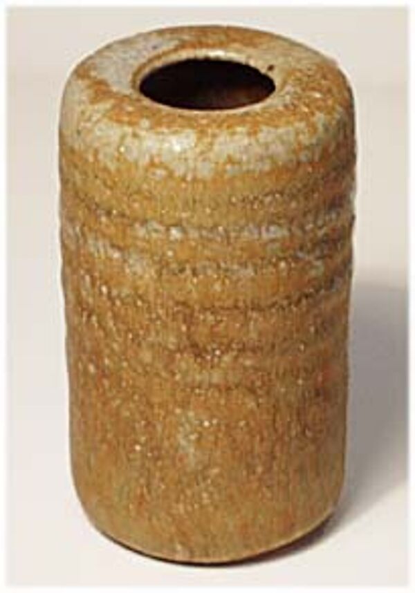 Zylindrischer, leicht gerillter Korpus. Ockerfarbener Scherben mit beige-bräunlicher, gesprenkelter Glasur. Höhe ca. 9,2 cm. Unterseitig bezeichnet, wohl 40er bis 60er Jahre.